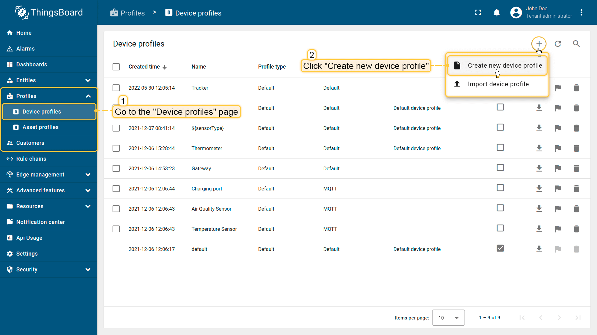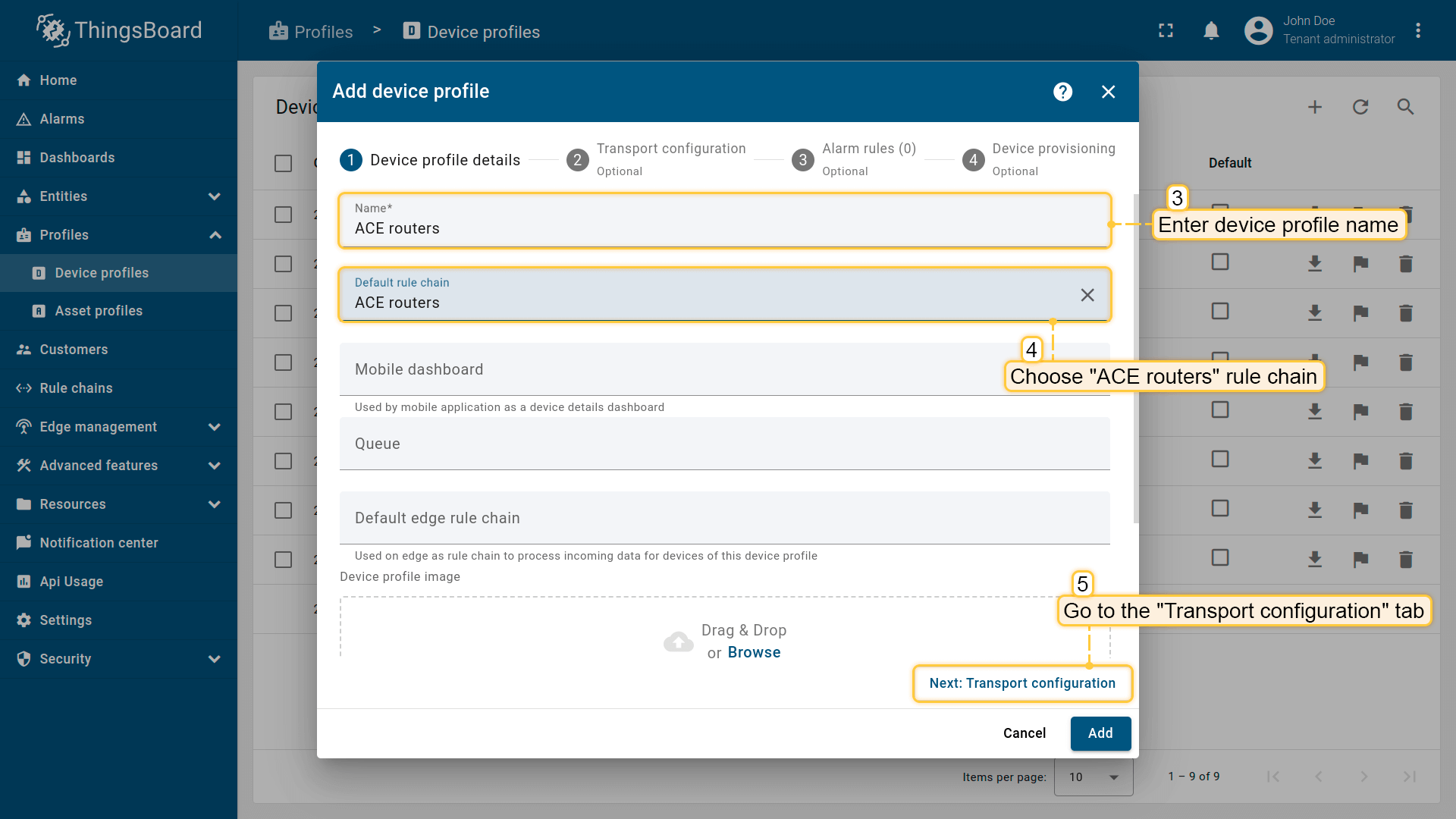 Go to Profiles > Device profiles and click on “Add” button > “Create new device profile”;