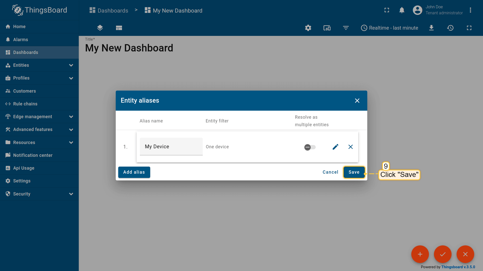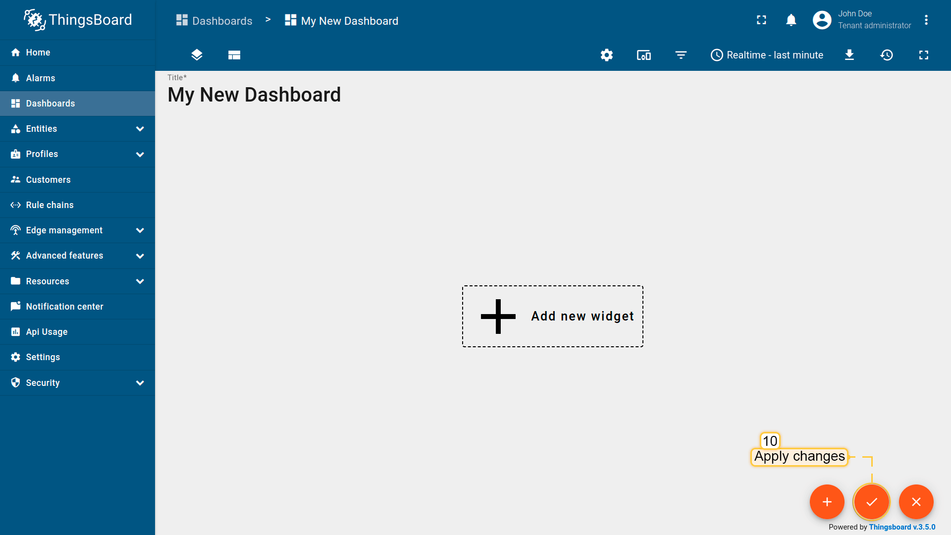 Import dashboardYou are able to import a dashboard in JSON format. To import a dashboard, you should go to the Dashboard group and click on the “+” button in the upper right corner of the page and choose “Import dashboard”. The dashboard import window should pop up, and you will be prompted to upload the JSON file and click “Import”. Below, you can find the dashboard JSON file: Check and control device data dashboard After importing, we should choose an entity alias for our device. If you did everything right, you have to see the following dashboard: