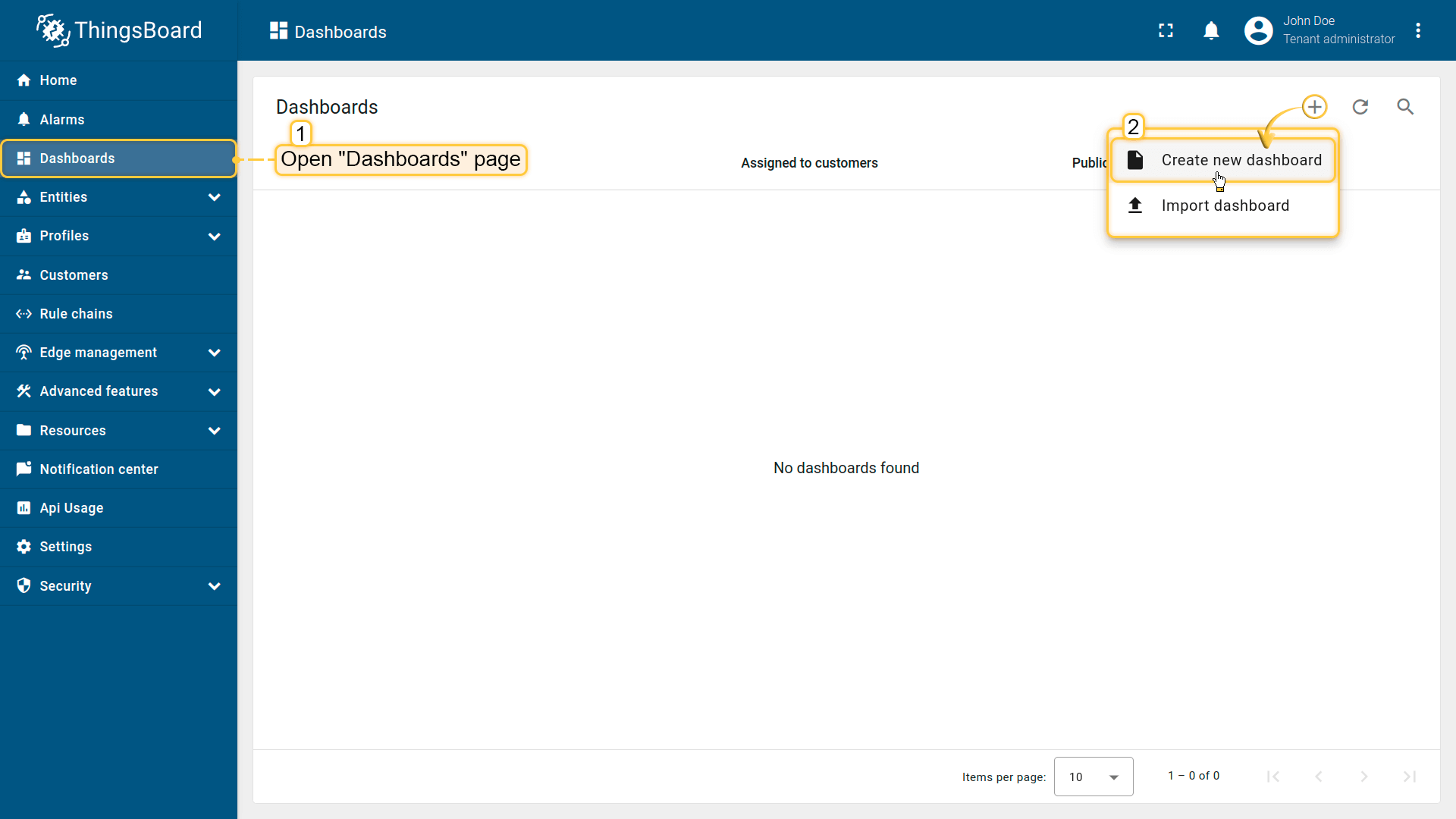 Explore the platform documentation to learn more about key concepts and features. For example, configure alarm rules or dashboards.