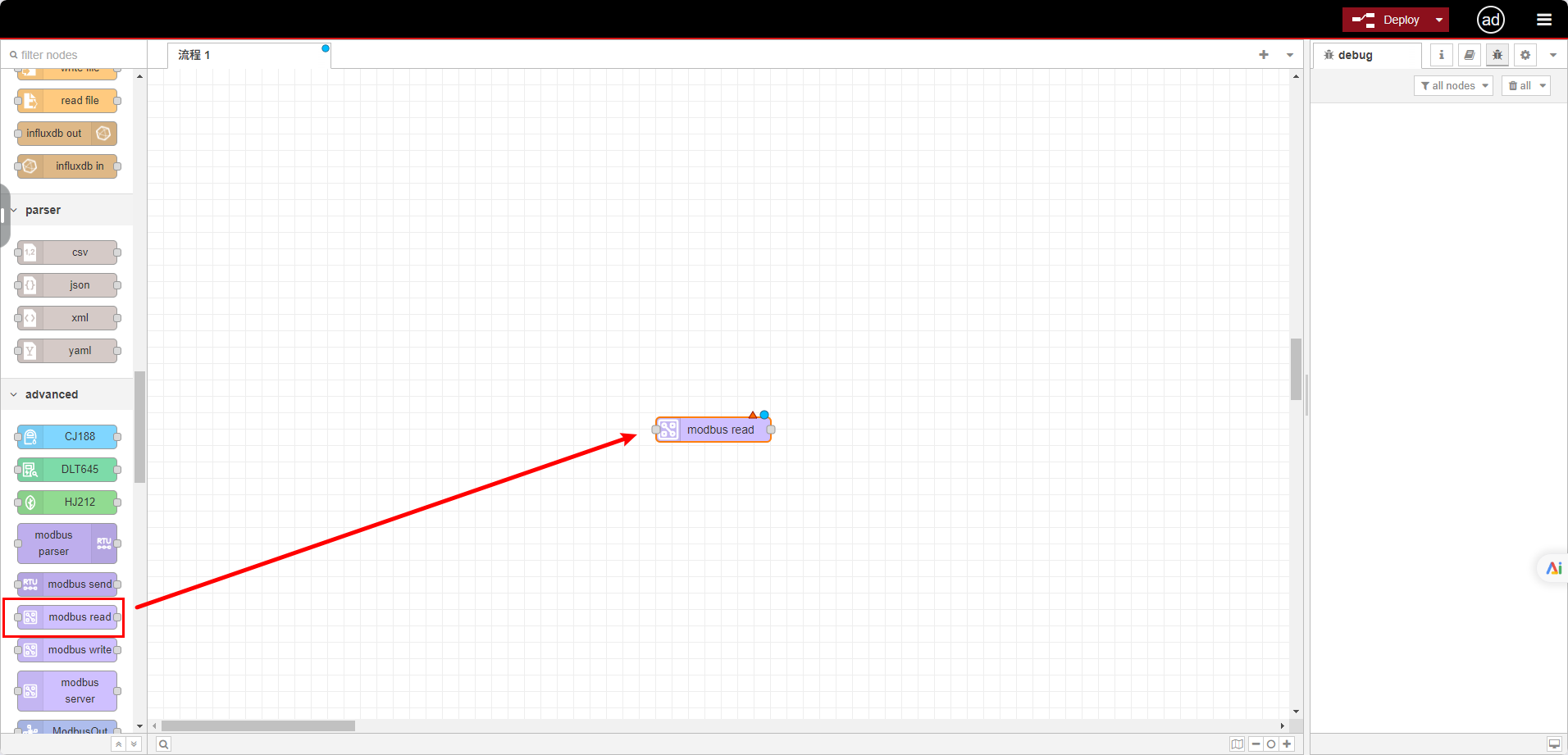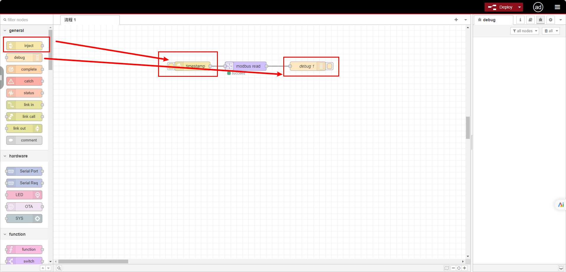 Drag out the inject node and debug node from the left node bar to trigger the process.