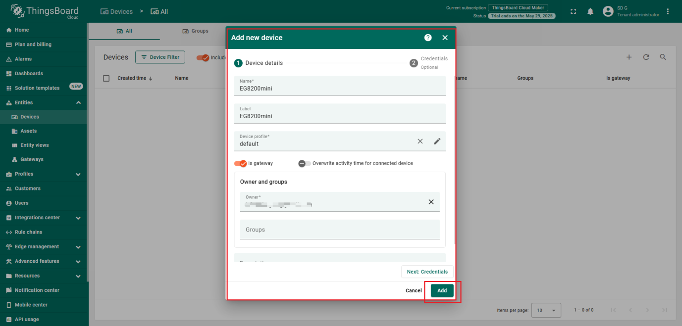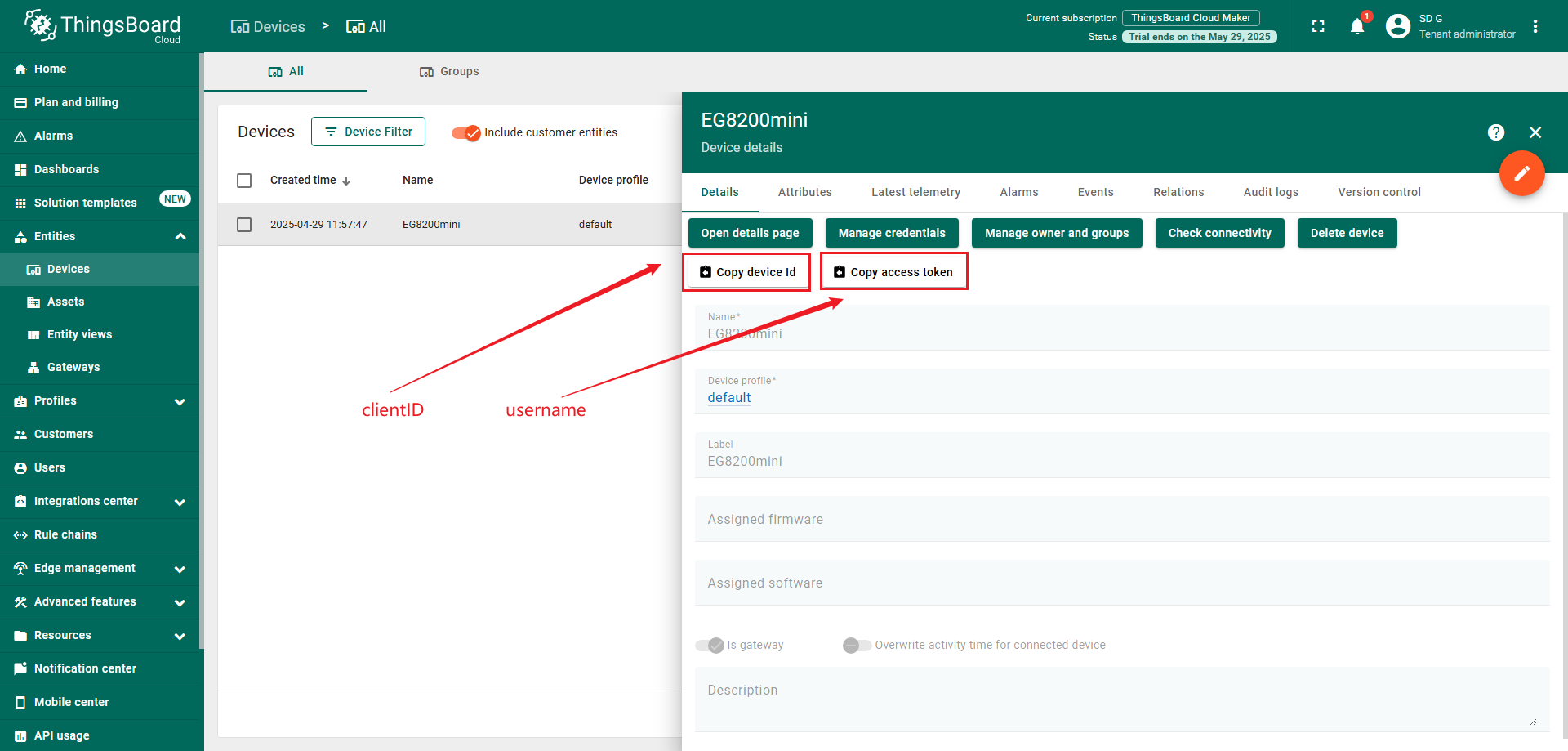 Click on the created device and fill in the configuration information in the following figure into the gateway, where the device ID is the MQTT client ID and the access token is the MQTT username.