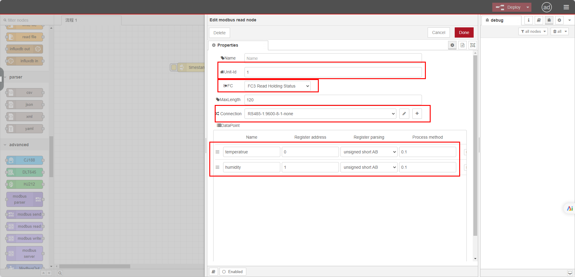 Click the inject node will show that the temperature and humidity data of the sensor are printed in the log bar on the right.