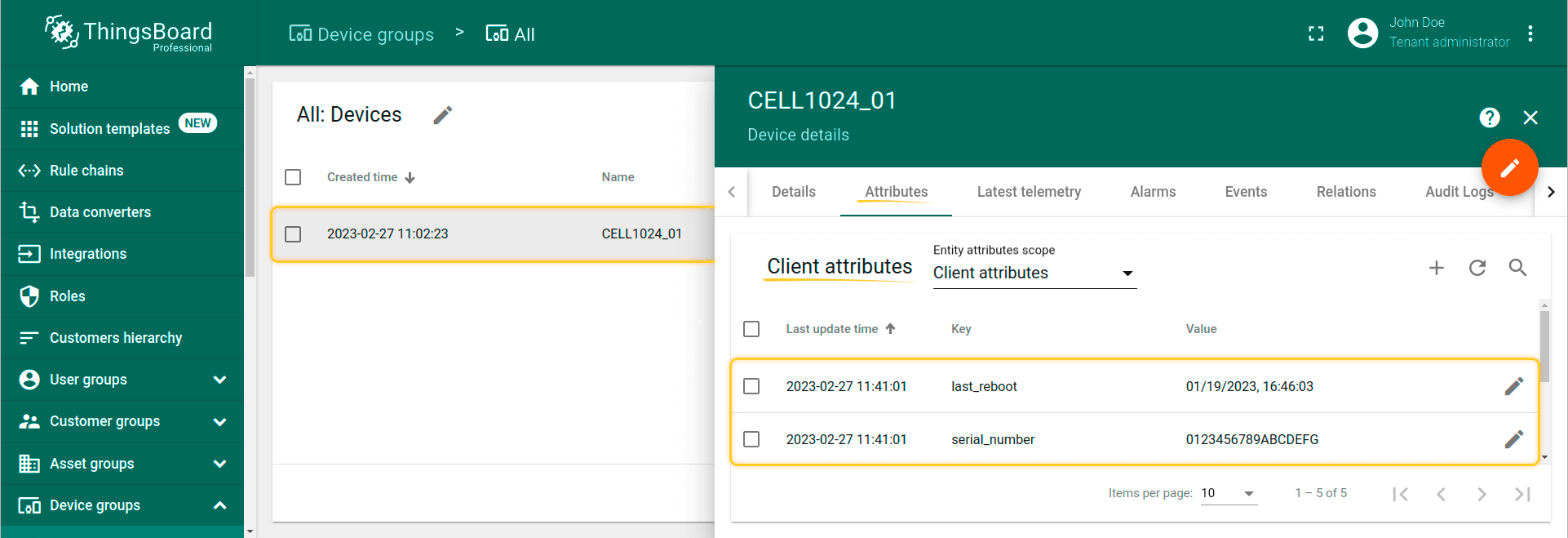 If you did everything is correct, we will see client attributes like the serial_number, last_reboot, device_model, etc.