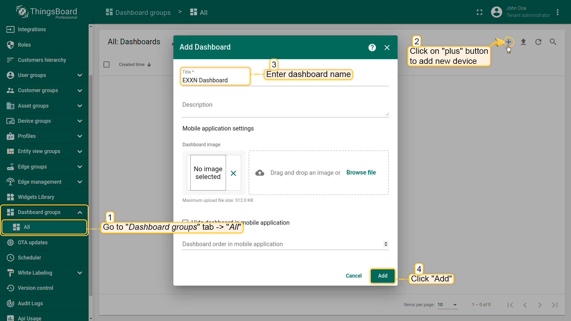 Go to the Dashboard groups tab -> All. Creat new dashboard by clicking the “plus” button in the upper right corner of the dashboards page. Enter dashboard name and click on “Add” button.