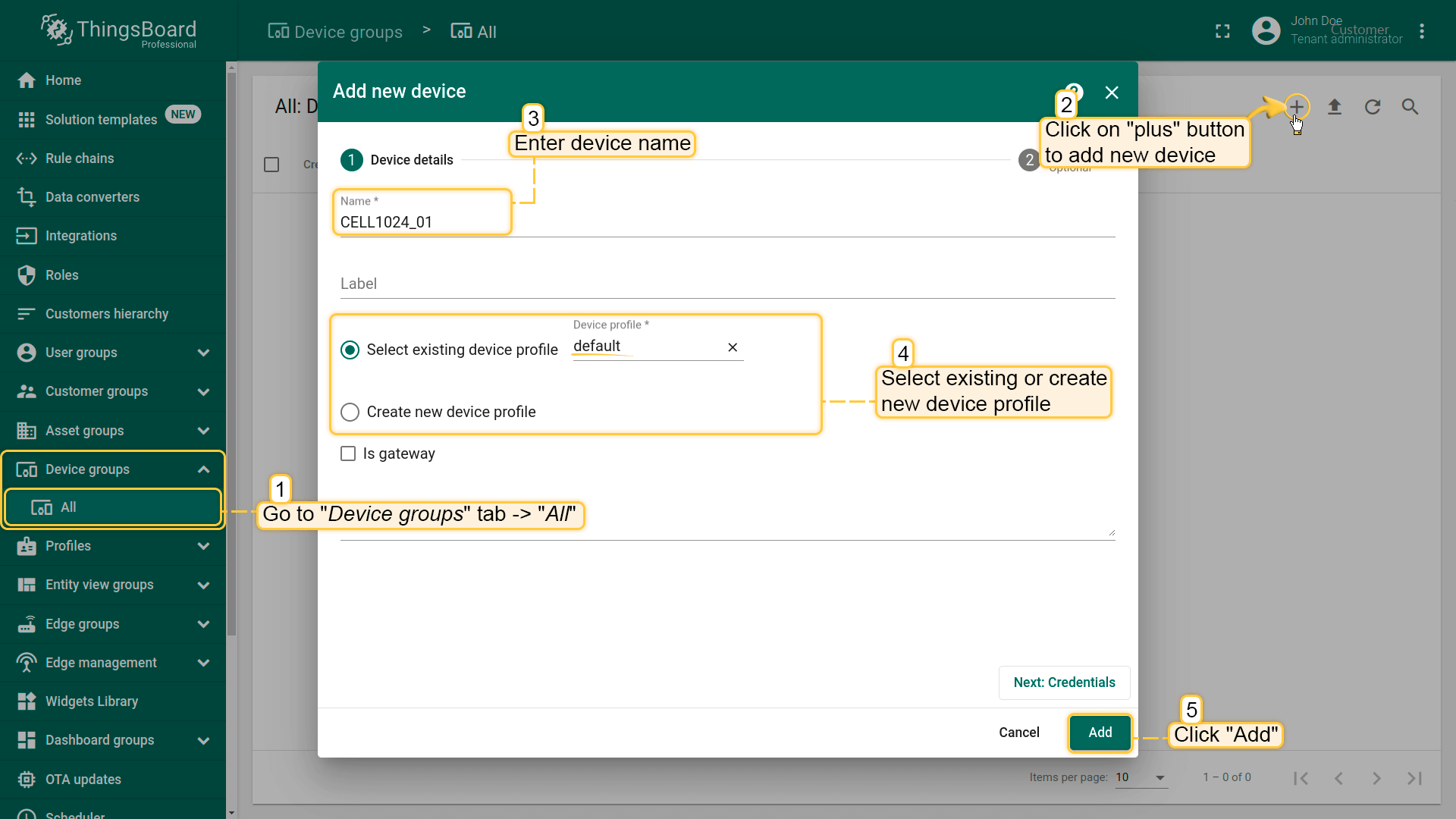 Go to “Device groups” tab -> “All” and click “plus” button to add a new device. Enter device name, select existing or create a new device profile and click on “Add” button.