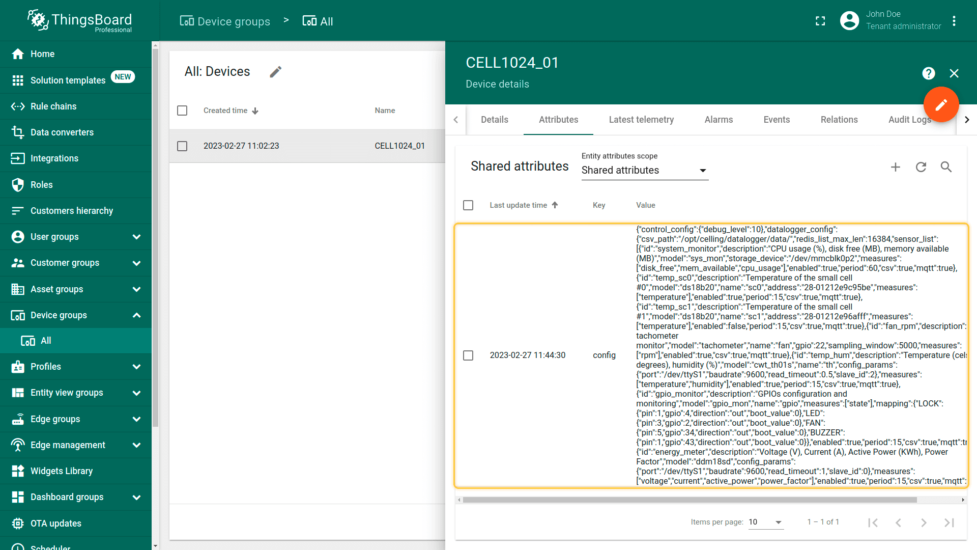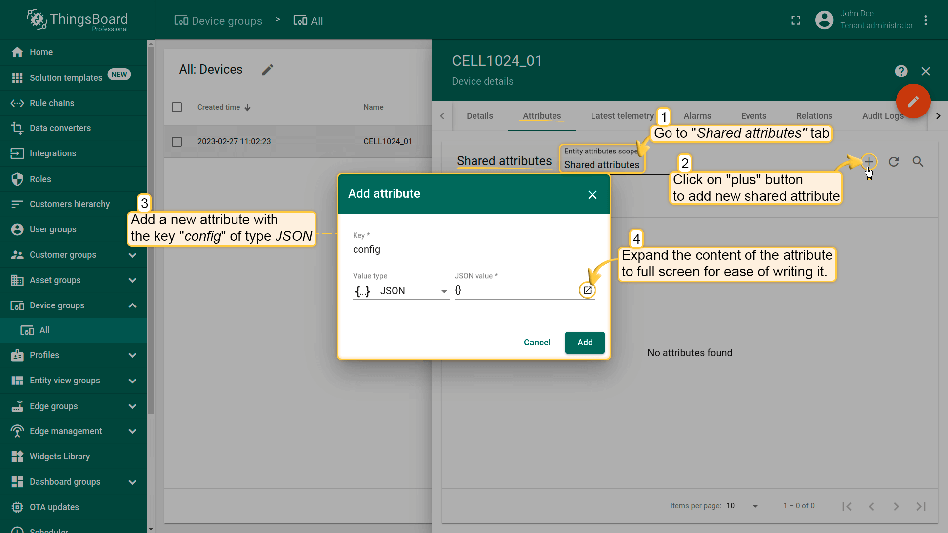 In order to configure the datalogger options of the EXXN IoT Gateway, we should create a new JSON “Shared Attribute” for the Device with the key “config”.