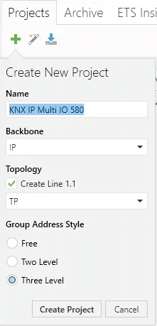 In the opened ETS main window, create new project (use default setting for creating, except “Name” field);