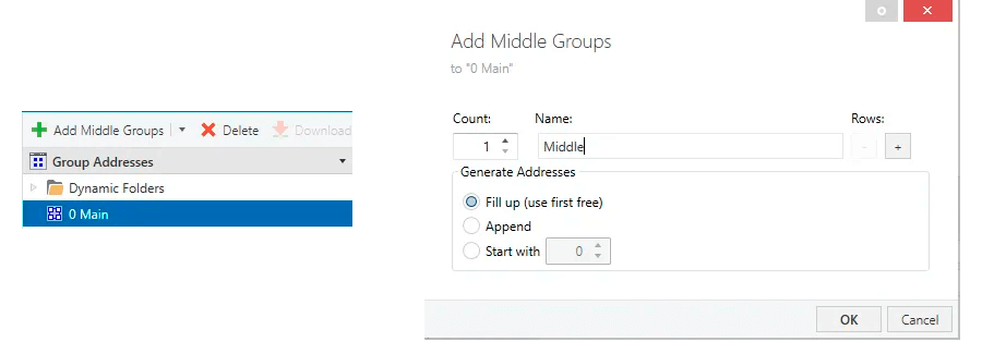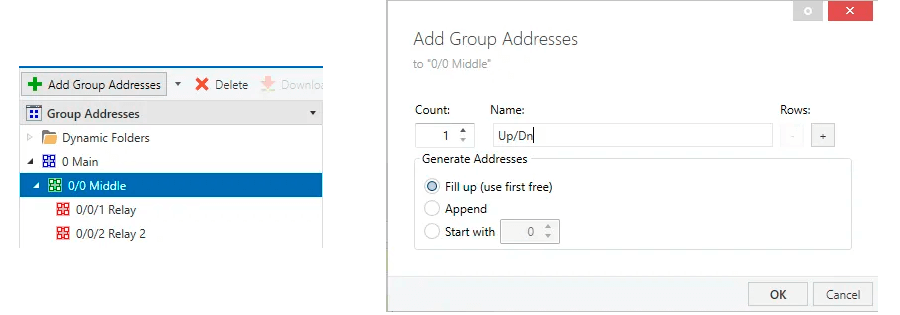 Click on “Add Group Addresses” and in the opened modal window fill in “Name” field with “Up/Dn” value, click “OK” button.