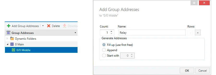 Click on “Add Group Addresses” and in the opened modal window fill in “Name” field with “Relay” value, click “OK” button.