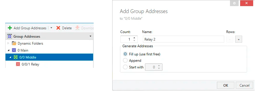 Click on “Add Group Addresses” and in the opened modal window fill in “Name” field with “Relay 2” value, click “OK” button.