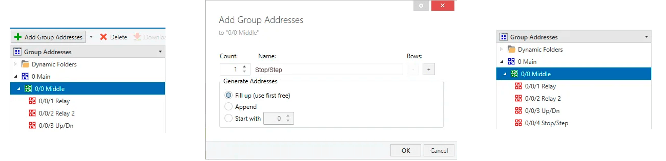 Click on “Add Group Addresses” and in the opened modal window fill in “Name” field with “Stop/Step” value, click “OK” button.