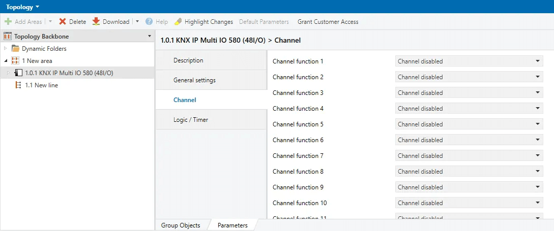 Click on added device in the left sidebar and select “Parameters” tab in the side right window. Select “Channel” tab.