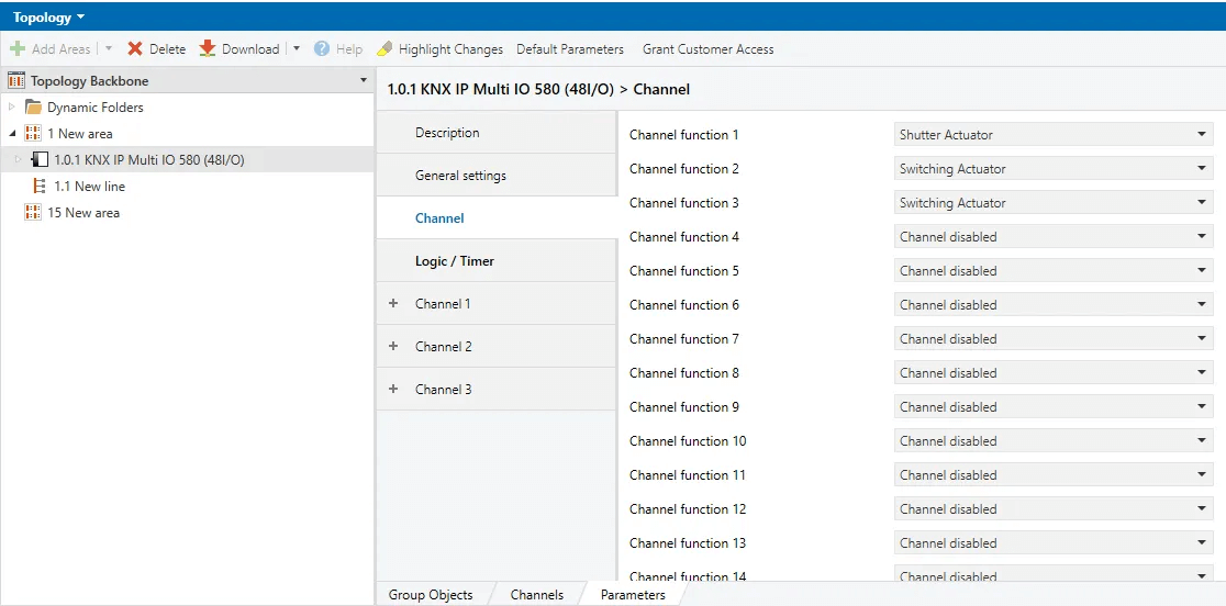 Select “Shutter Actuator” for “Channel function 1”, “Switching Actuator” for “Channel function 2” and “Channel function 3”. You can find added Group Objects in the “Group Objects” tab.