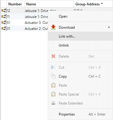 - In the “Group Objects” tab right click on first group object (Jalousie 1: Drive stop) and select “Link with…” button.