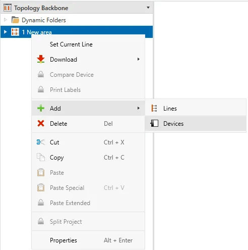 Right click on “1 New area” subitem and select “+ Add” button from the dropdown list, and click on “Devices” button.