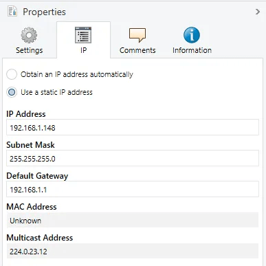 Click on added device, on the right sidebar, select “Properties” tab and click on “IP” button. Select “Use a static IP address” option and fill in “IP Address”, “Subnet Mask”, “Default Gateway” fields with your corresponding controller (you can find controller IP address on the built-in display) and network settings.
