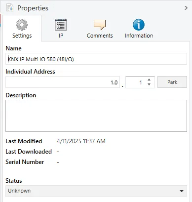 Click on “Settings” button under “Properties” tab and fill in “Individual Address” with “1.0.1”, click on “Park” button.