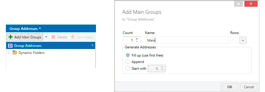 Under the projects tabs bar click on “Topology” dropdown list and select “Group Addresses” from the list. Click on “Add Main Groups” and in the opened modal window fill in “Name” field with “Main” value, click “OK” button.