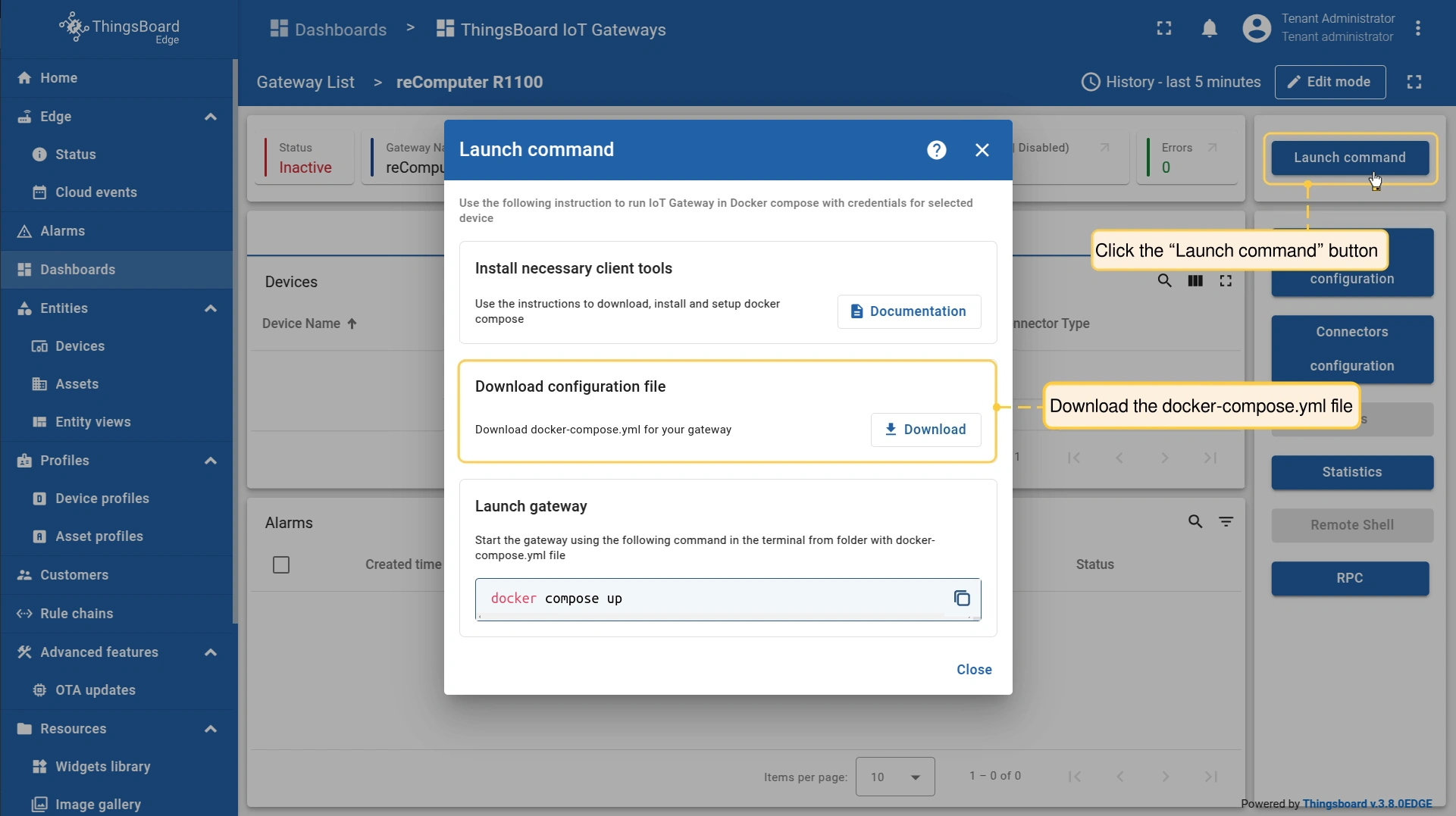 On the Gateway device page, click the “Launch command” button and download docker-compose.yml for your gateway.