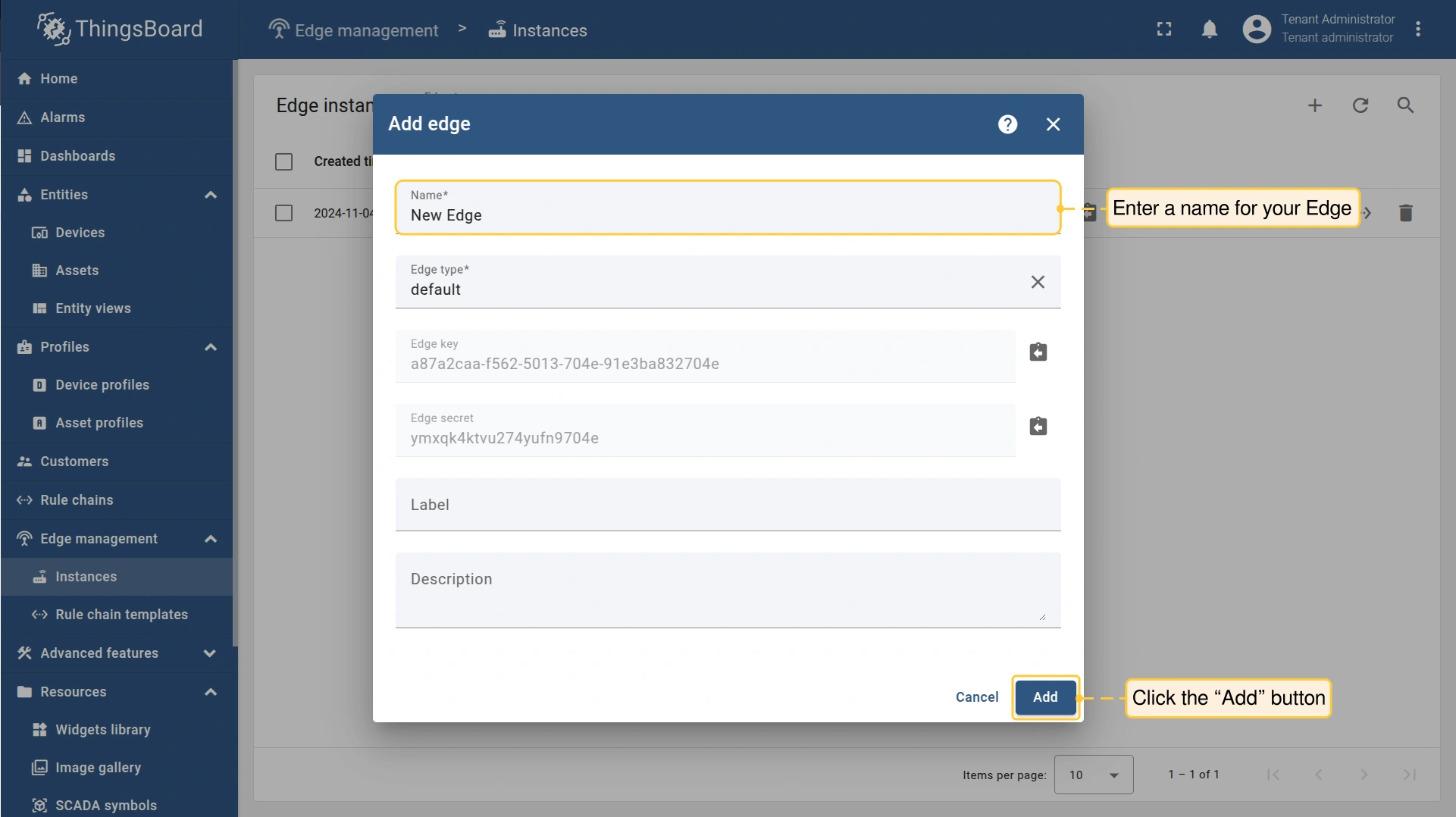 Enter a name for your Edge in the “Name” field and click the “Add” button to confirm the addition of your new Edge.