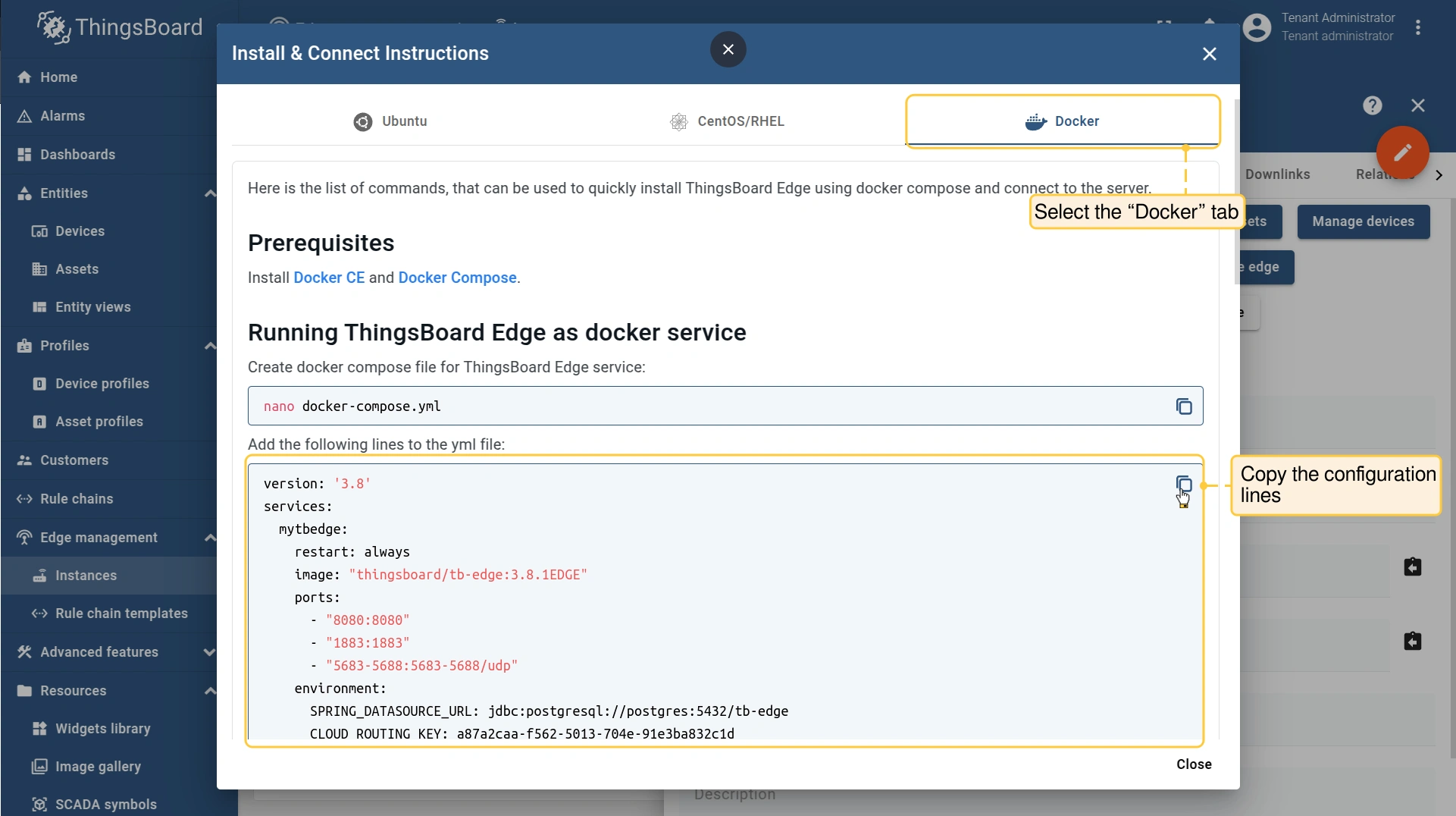 Then, you need to fill this file with the configuration lines. Once the Edge instance has been created, the preset installation instructions will be available for use. They contain important credentials, such as Edge Secret, Edge Key, etc. To access these configurations: