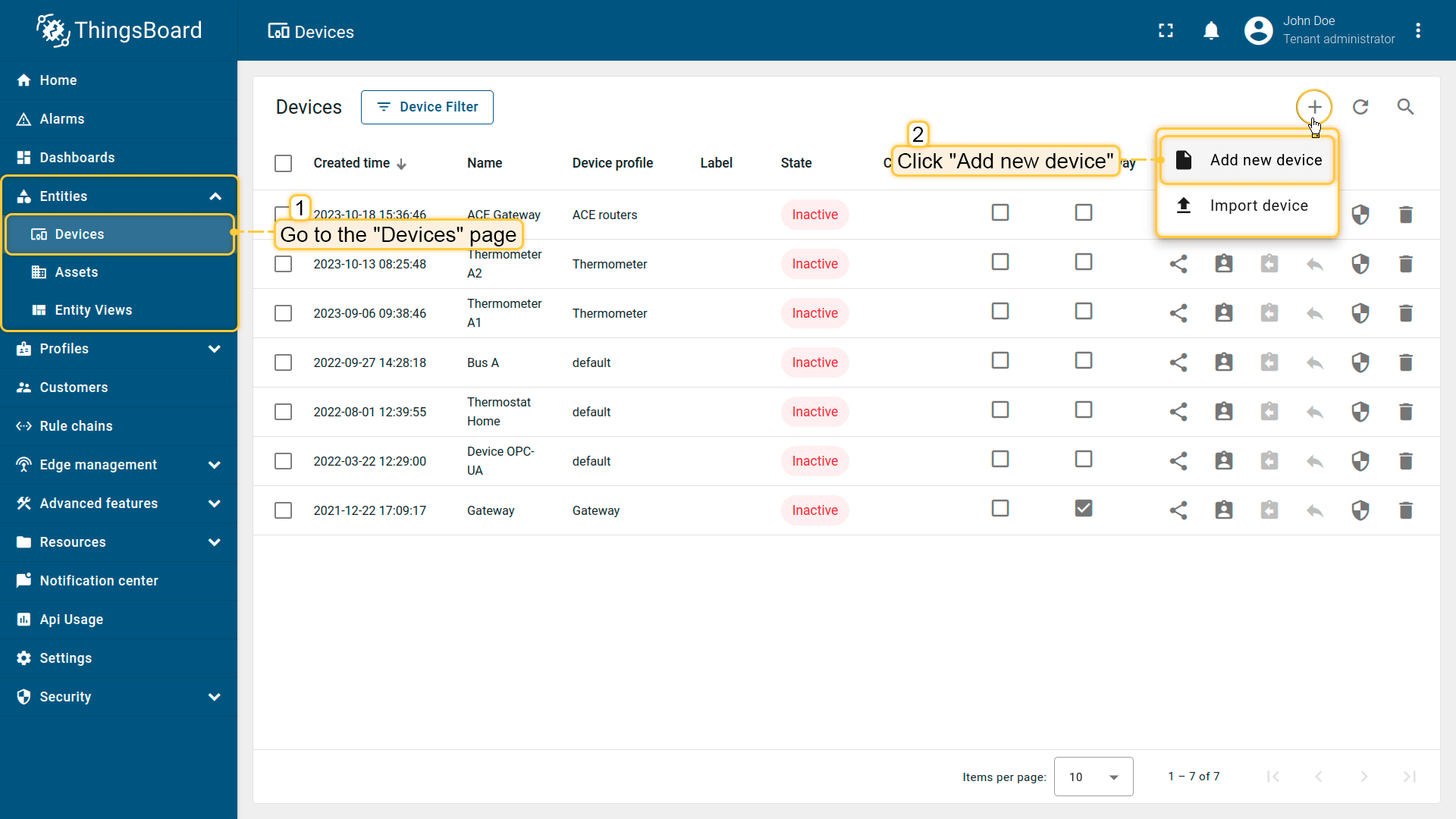 Open the Devices page. By default, you navigate to the device group “All”. Click on the “+” icon in the top right corner of the table and then select “Add new device”;