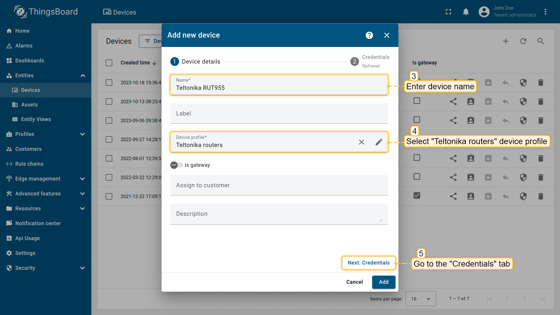 Input device name. For example, “Teltonika RUT955”. Select created device profile from the step above, in our case “Teltonika routers”;