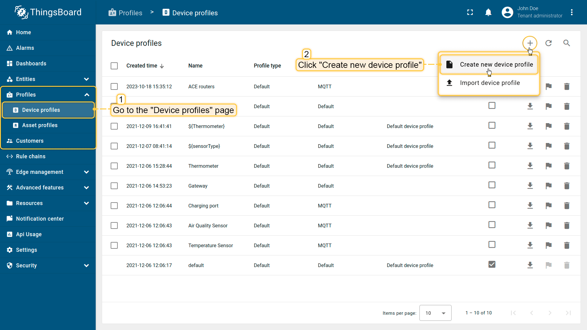 Go to Profiles > Device profiles and click on “Add” button > “Create new device profile”;