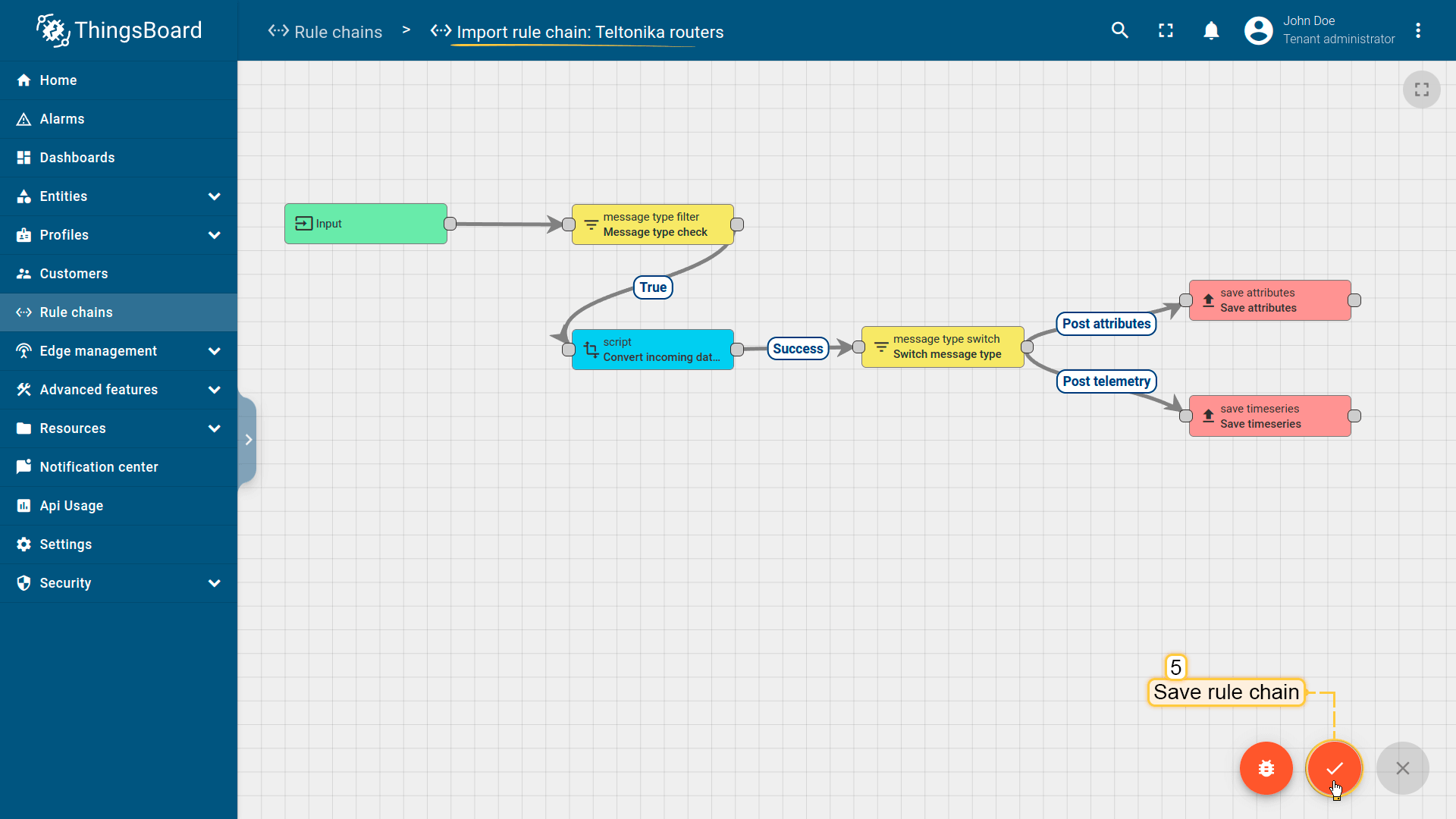 The imported rule chain will open. Click on the “Apply changes” button to save the rule chain. Then, go back to the main “Rule chains” page;