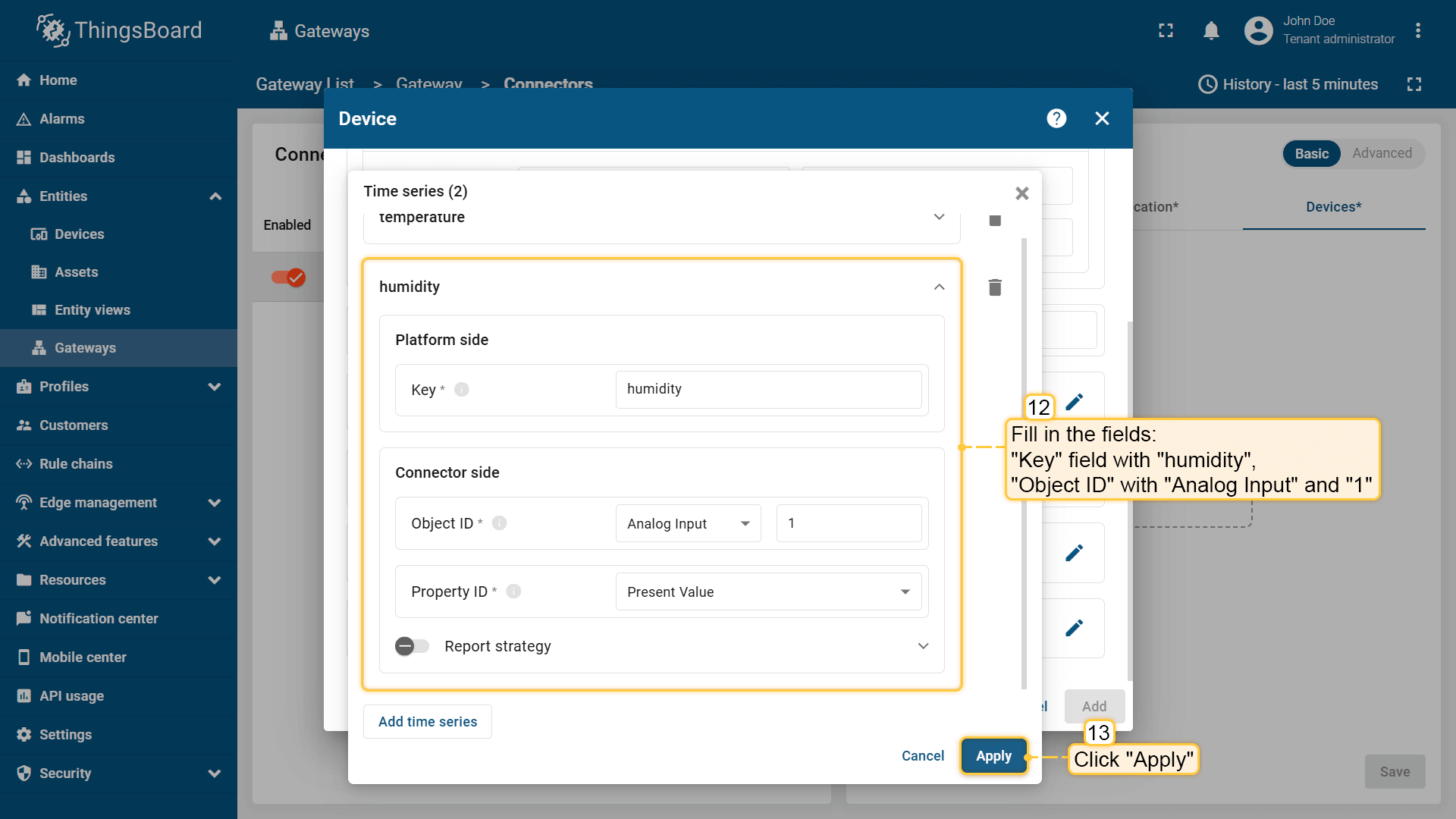 • Fill in the “Key” field with “humidity”, “Object ID” with “Analog Input” and “1”;