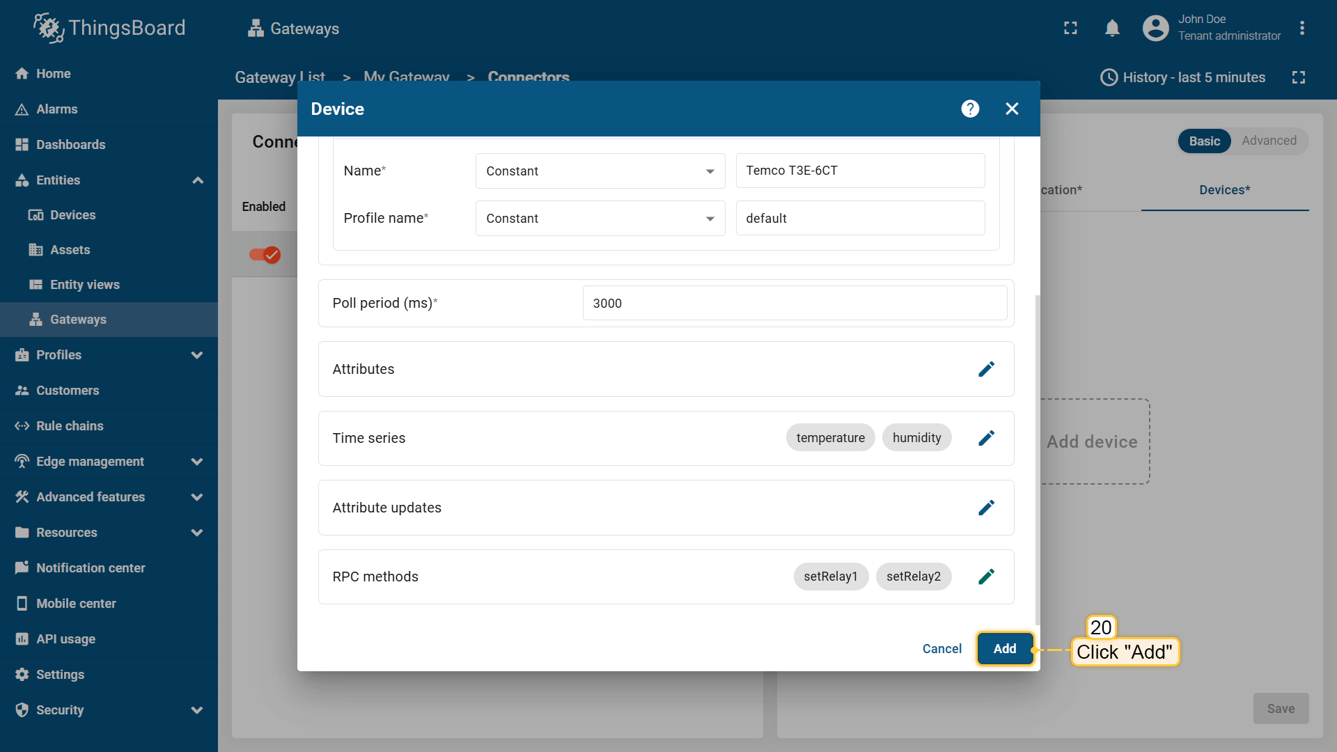 • Fill in the “Host” and “Port” fields (you can find this information in the T3000 software). Fill in the “Device name” and “Device profile name” with “Temco T3E-6CT” and “default” respectively. Poll period is set to 3000 ms (you can change it according to your needs);