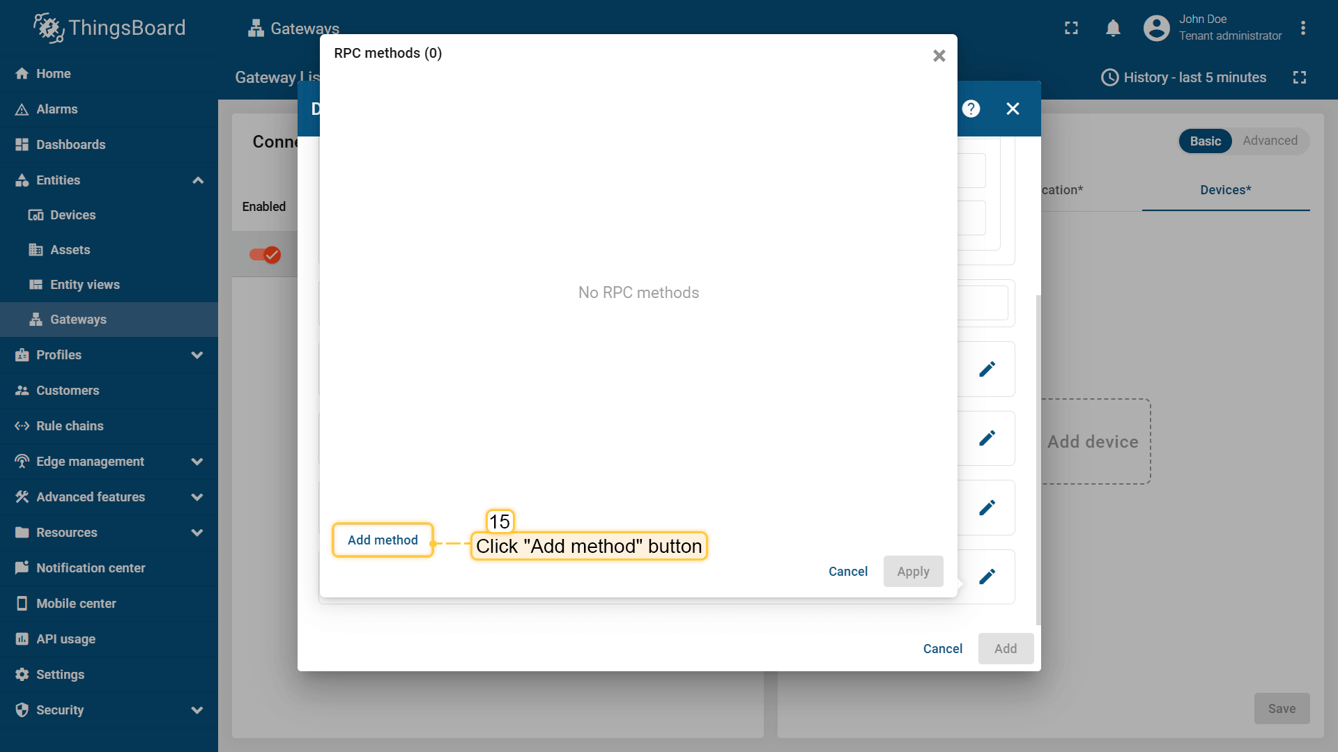 • Open the IoT Hub in your browser and log in. Go to “Entities” > “Gateways” tab in the sidebar and click on “+” button. Fill in “Name” and “Device profile” fields and click “Create” button;