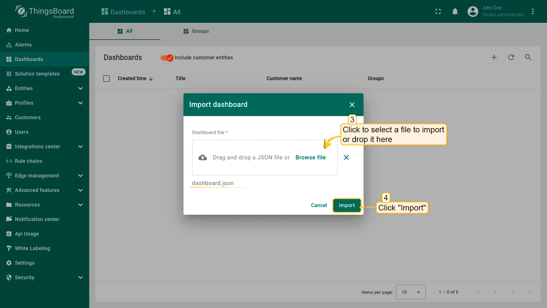 • In the dashboard import window, upload the JSON file and click “Import” button.