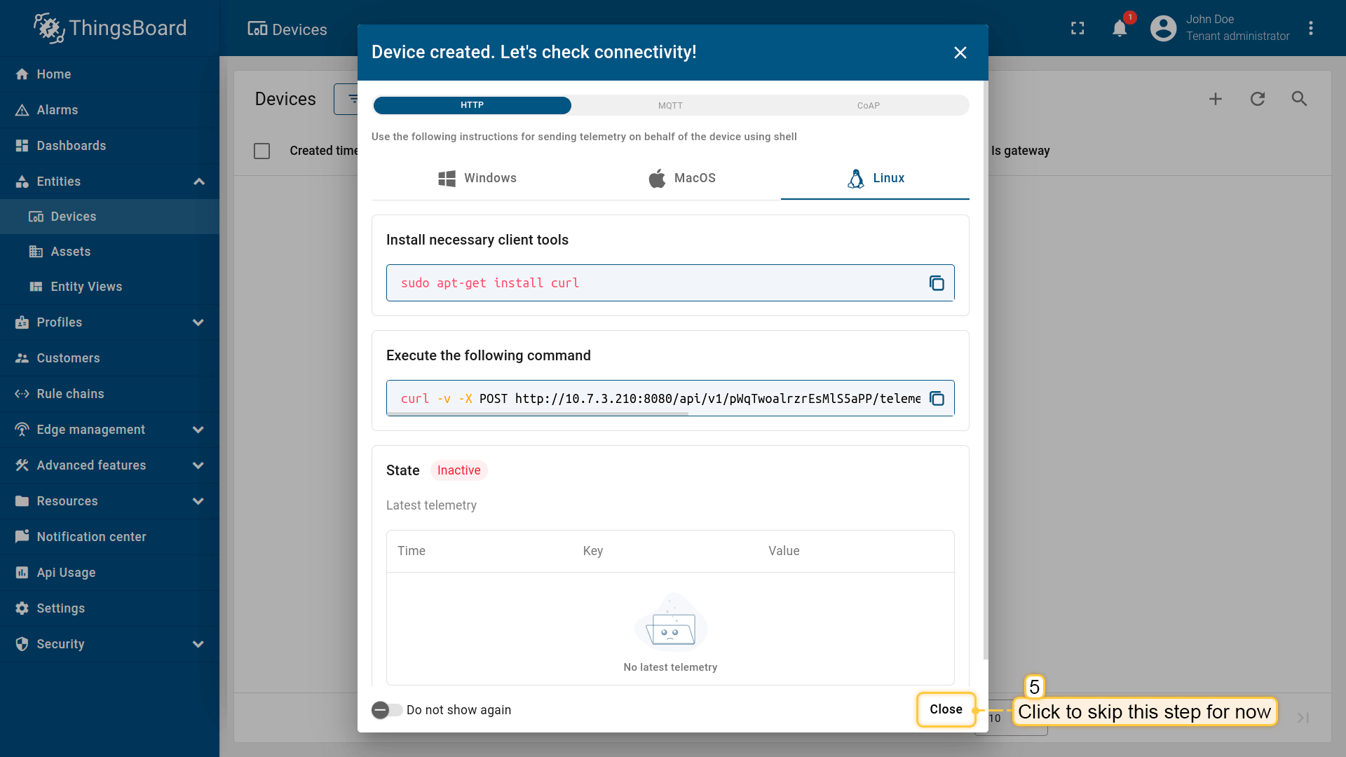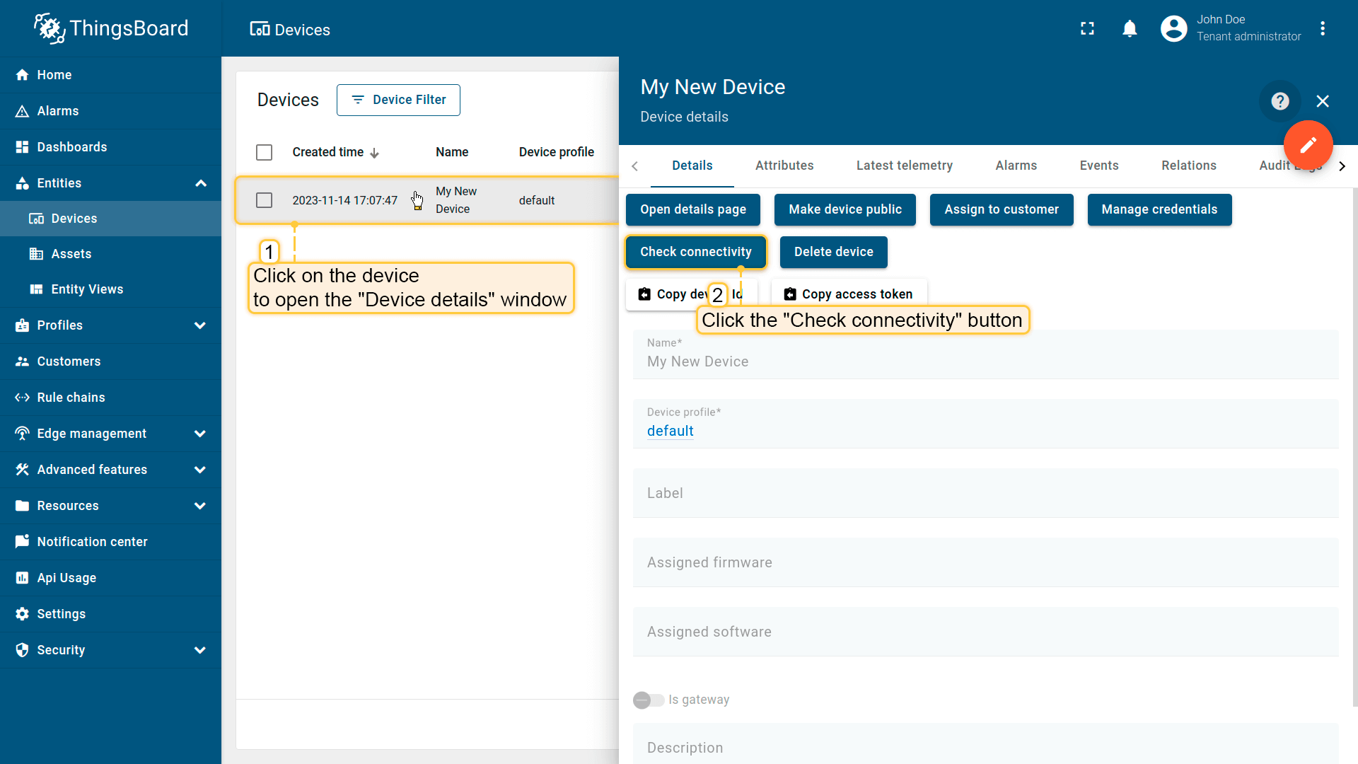 Let's assign device to the customer. The customer users will have ability to read and write telemetry and send commands to devices.