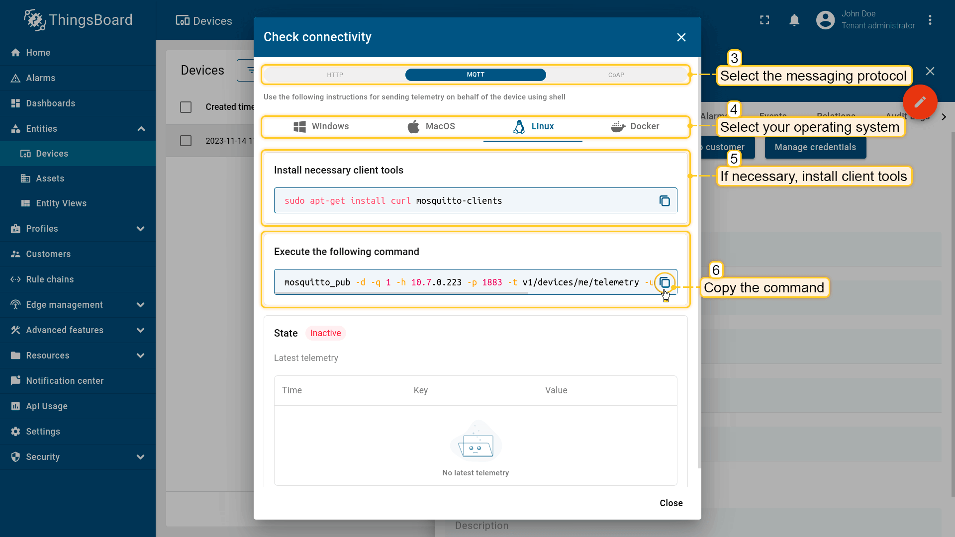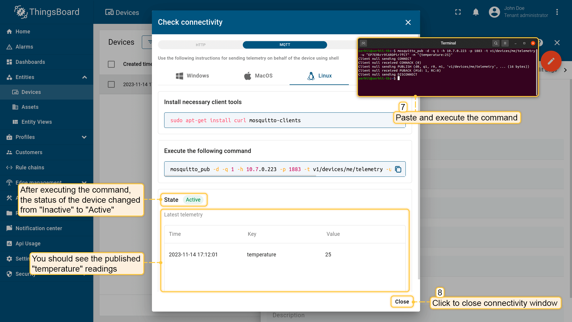 - Execute the copied command in Terminal. Once telemetry data (e.g., temperature readings) is successfully published, the device status will change from "Inactive" to "Active," and you'll see the data displayed. You can now close the connectivity window.