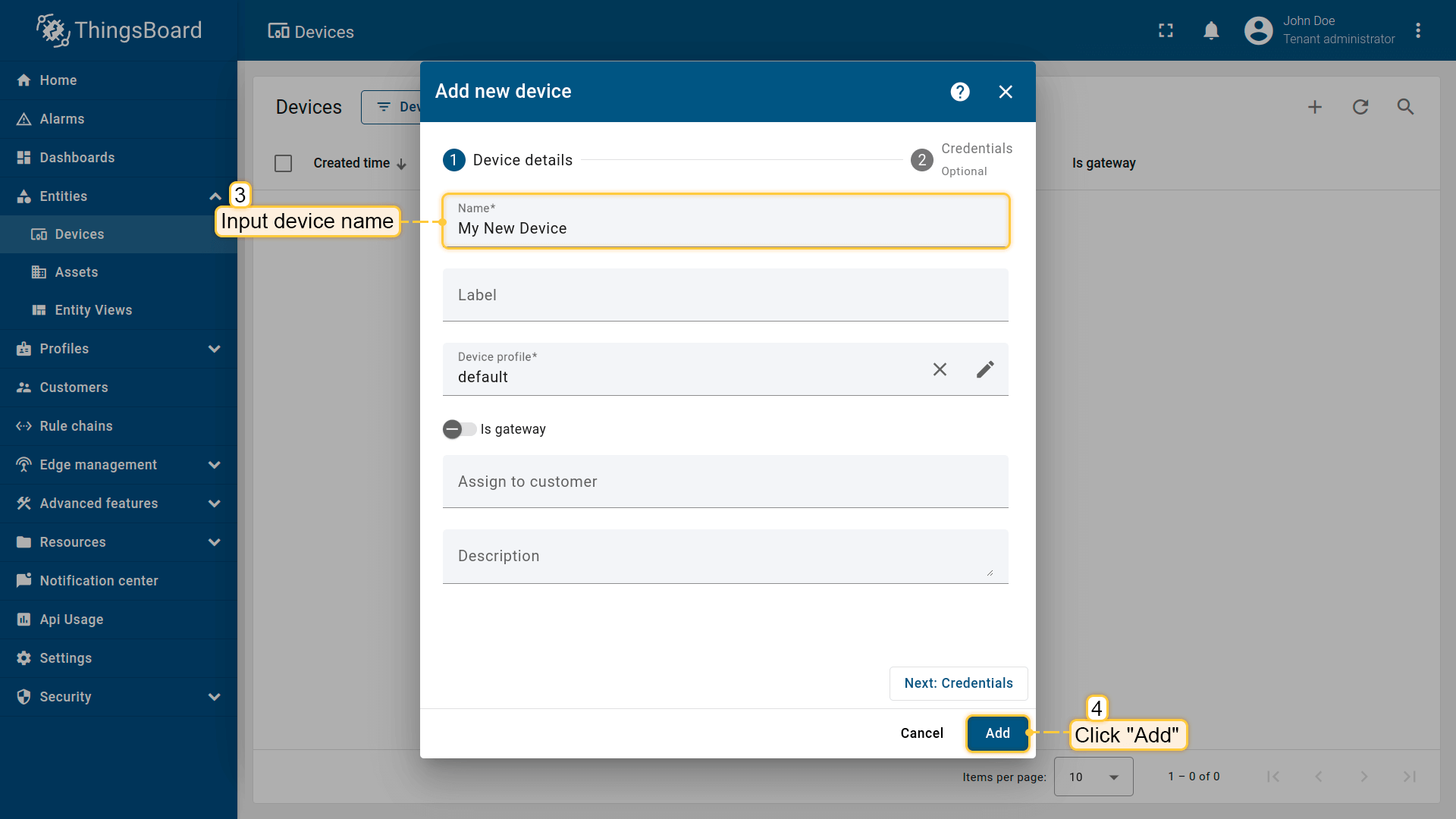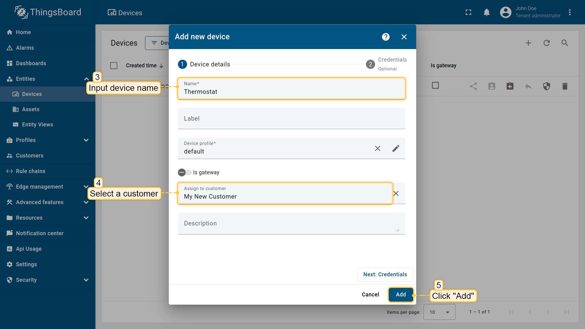 - Input device name (for example, "Thermostat") and select the customer in the "Assign to customer" field to whom you want to assign the new device. Then, click "Add";