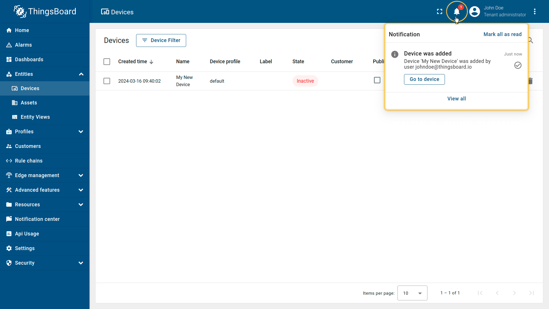 You will also receive a notification upon adding devices. Click the bell icon (top right) to view notifications.
