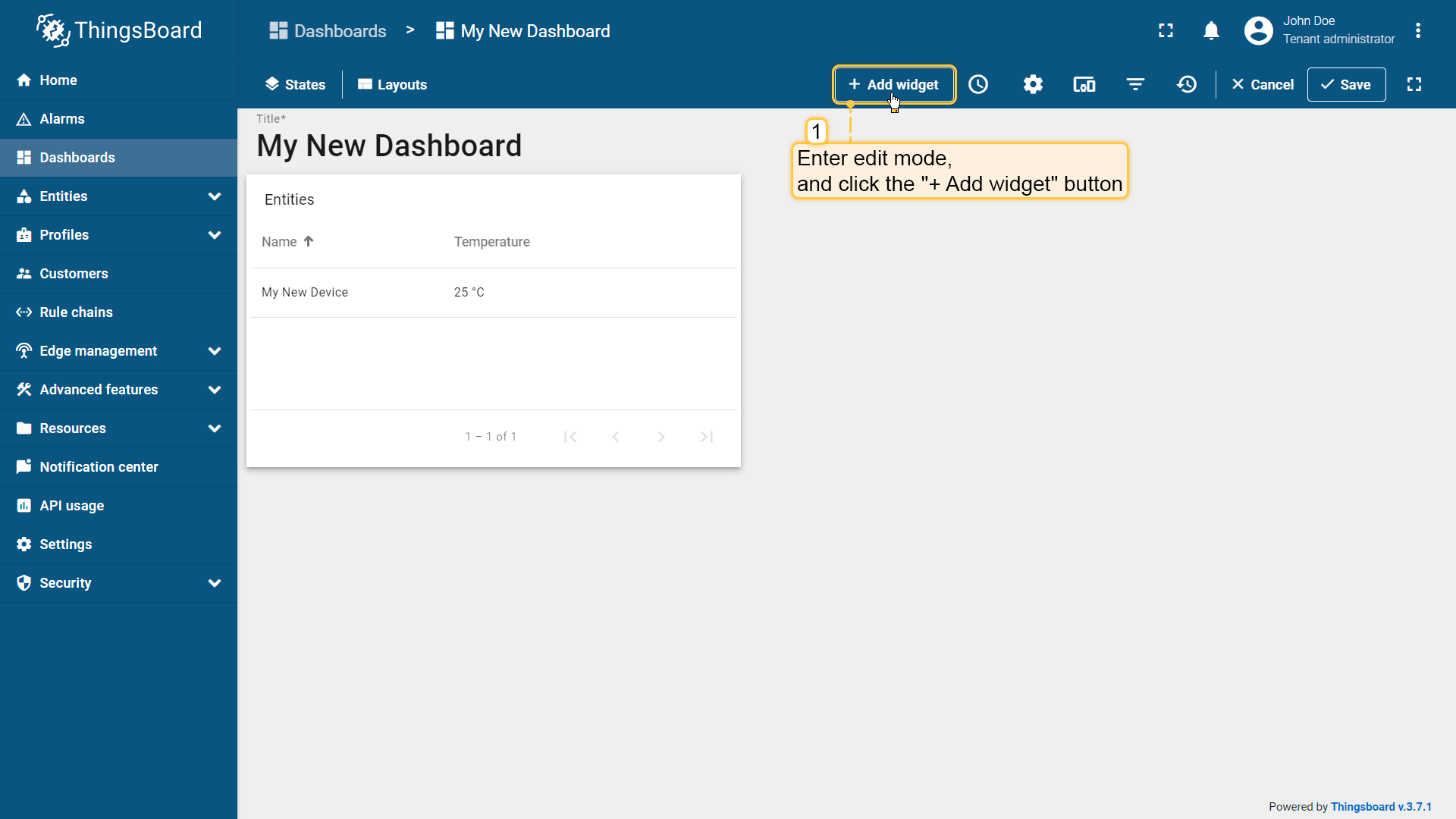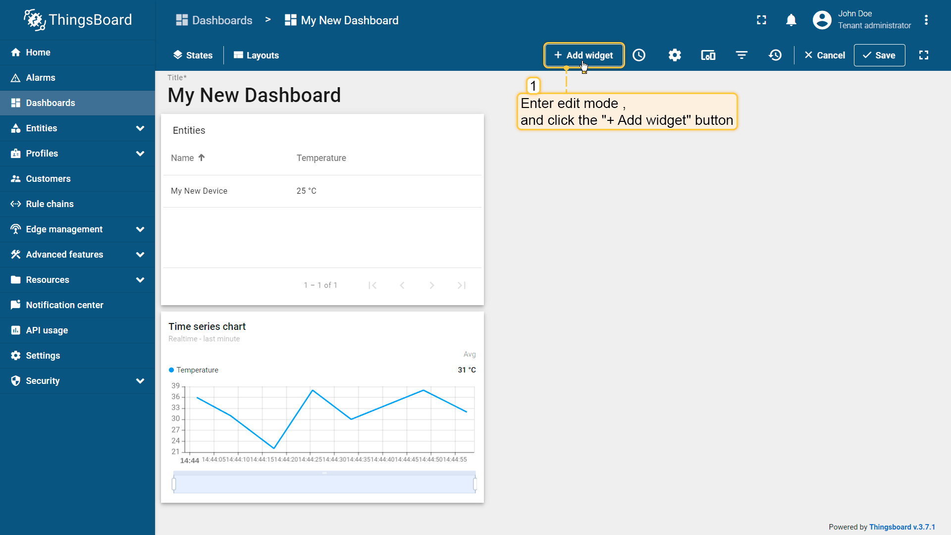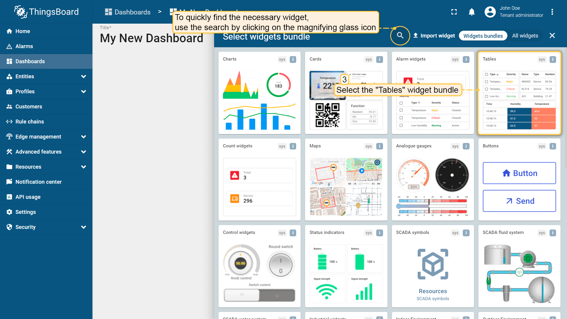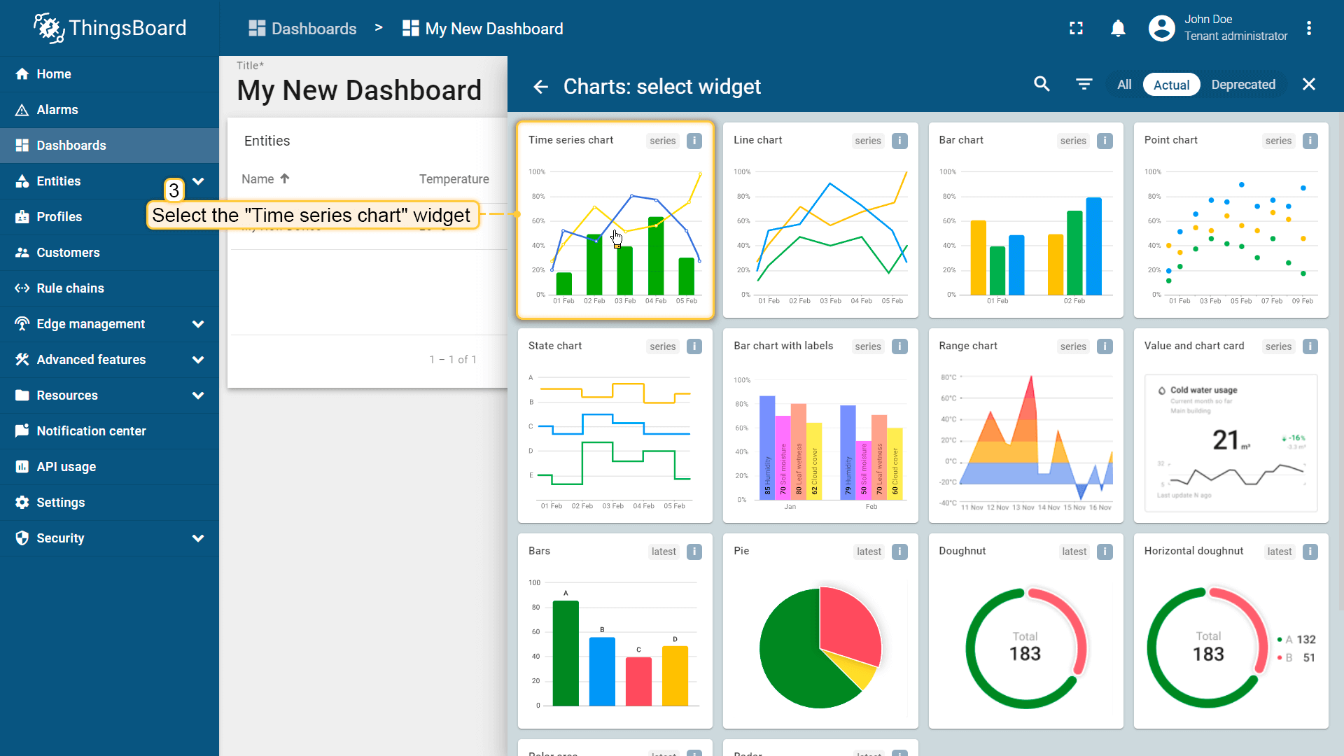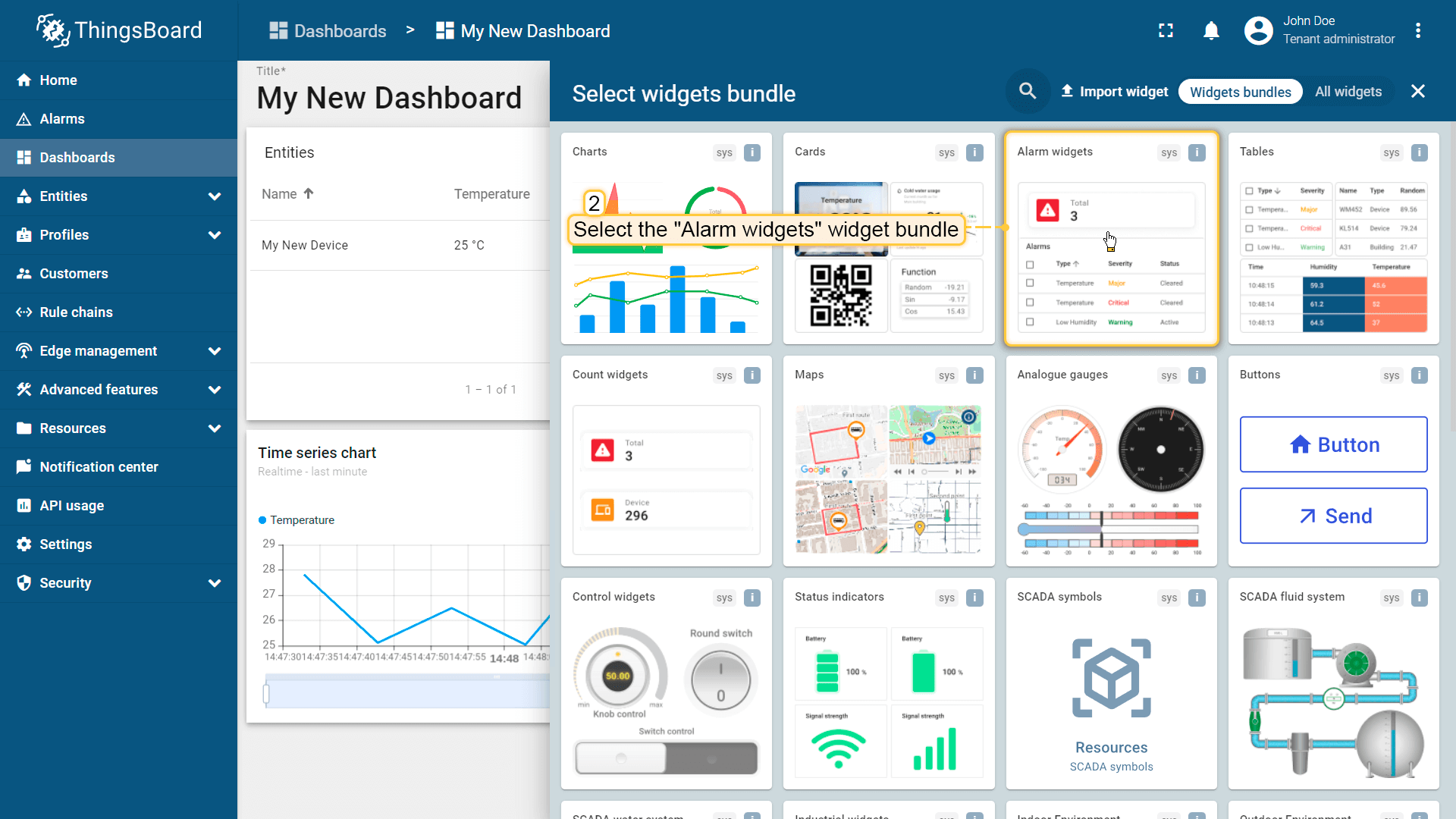 Let's create a dashboard and add three widgets to it in order to display a list of entities and their latest values, as well as show alarm signals related to the specified entity.