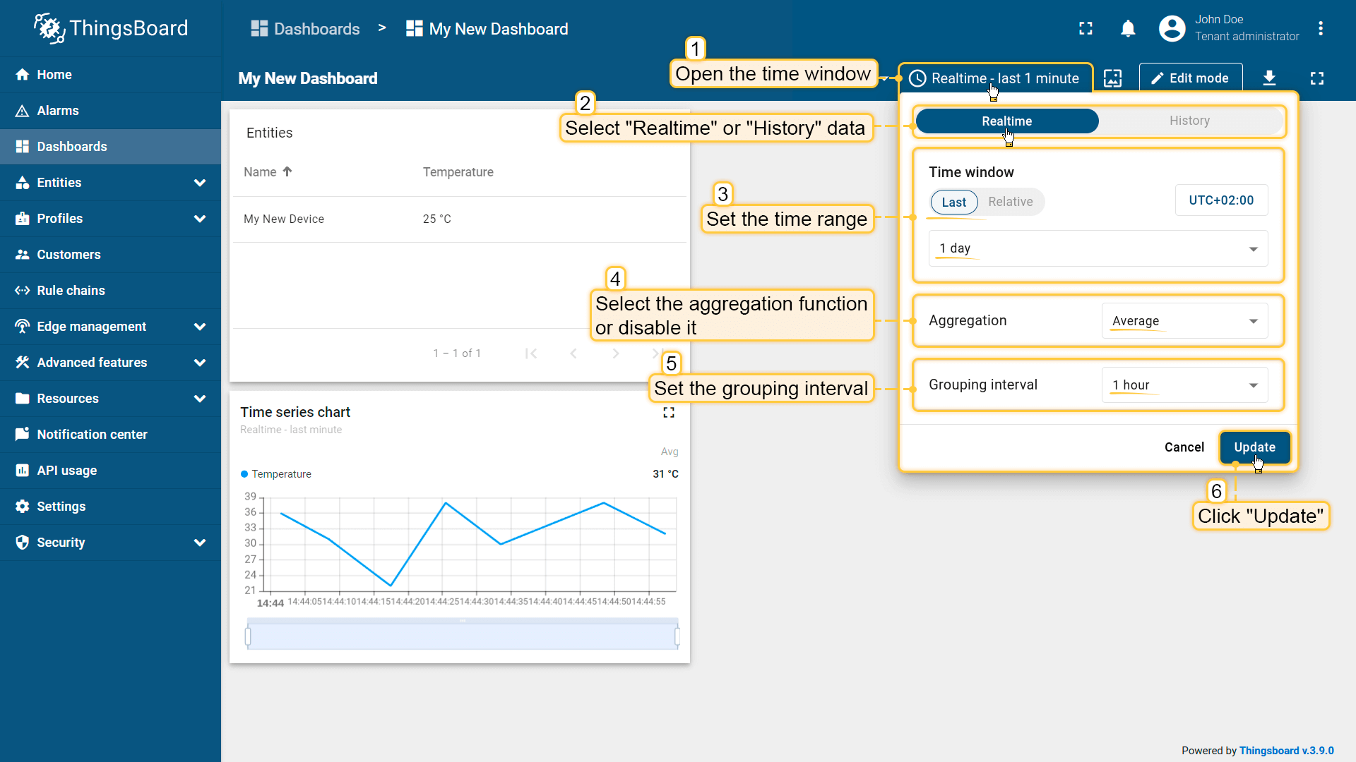 To add the chart widget we need to select it from the widget library. Chart widget displays multiple historical values of the same data key (“temperature” in our case). We should also configure the time window to use the chart widget.