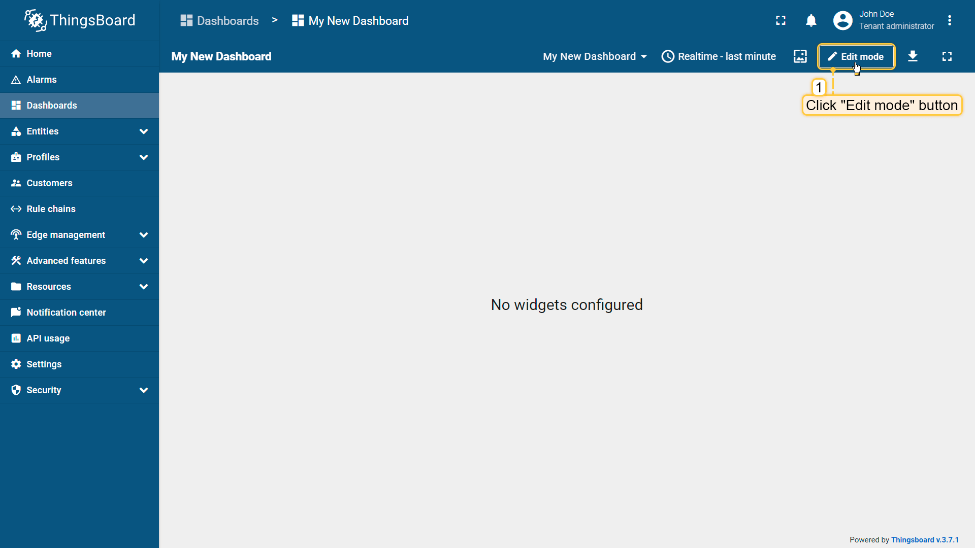 - Enter dashboard edit mode. Simply open the dashboard and click the "Edit mode" button found in the upper right corner of the screen;