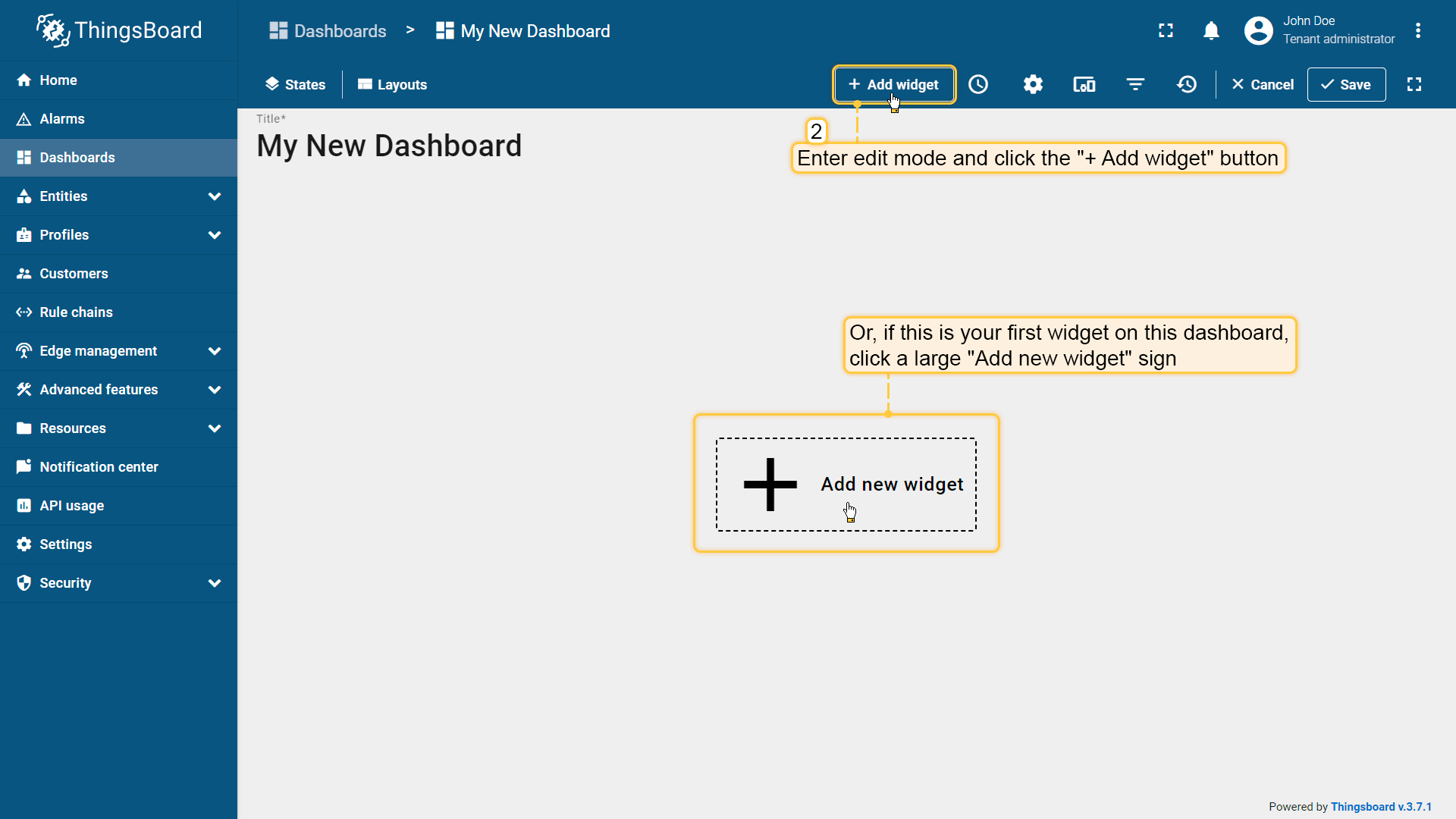 - After creating the dashboard, it will open automatically, and you can immediately start adding widgets to it. To save the dashboard, click "Save" button in the upper right corner.