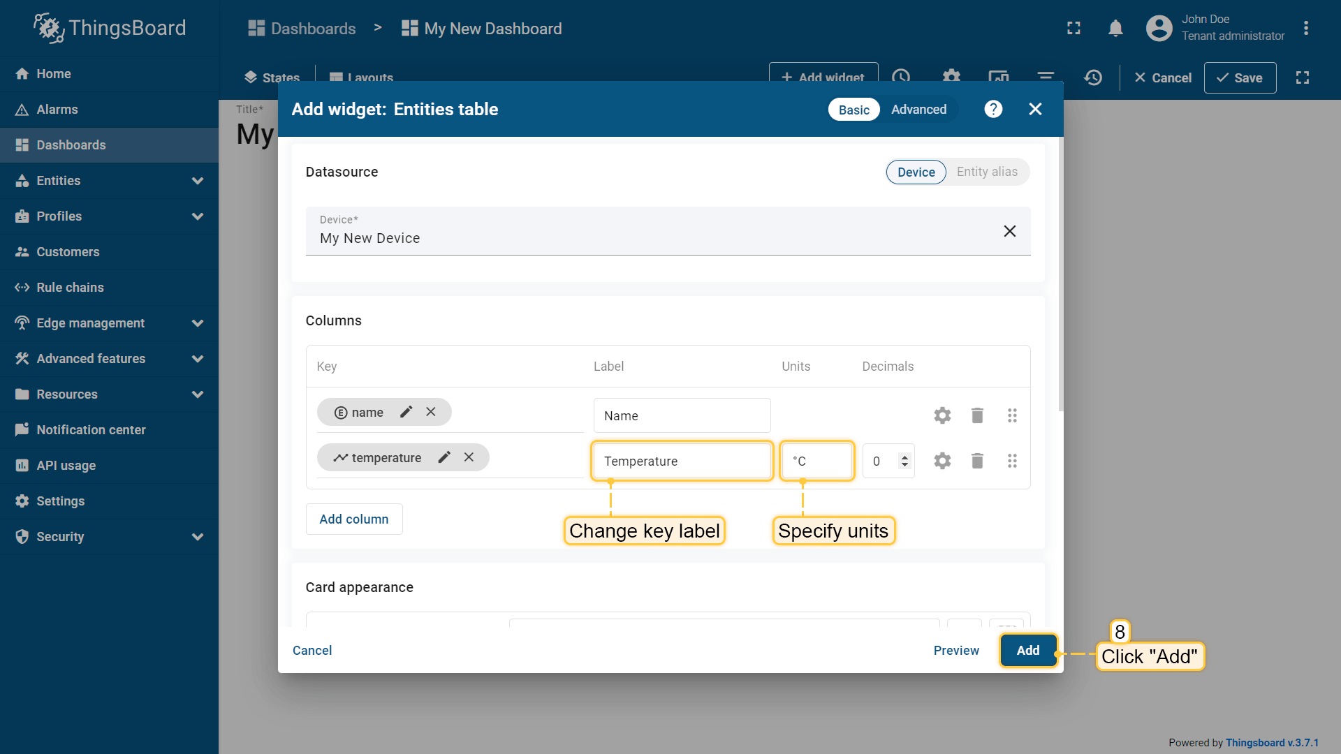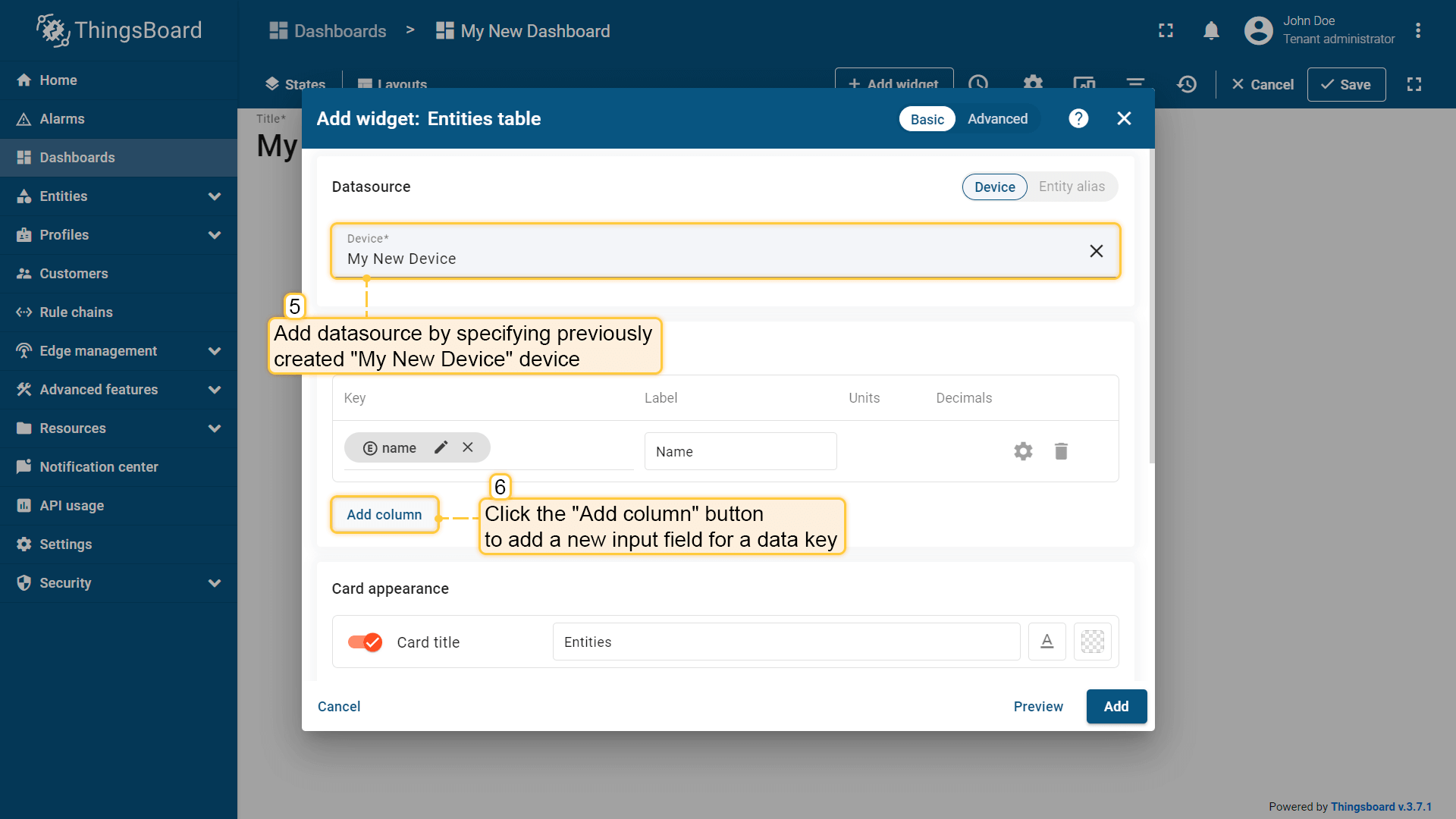 - The "Add Widget" window will appear. Specify the previously created device "My New Device" as the data source in the "Device" field. The "name" key has already been added to the "Columns" section, which is responsible for the column with the device name. You need to add another column that will display the value of the "temperature" key. To do this, click "Add column" to add a new field to enter the data key;