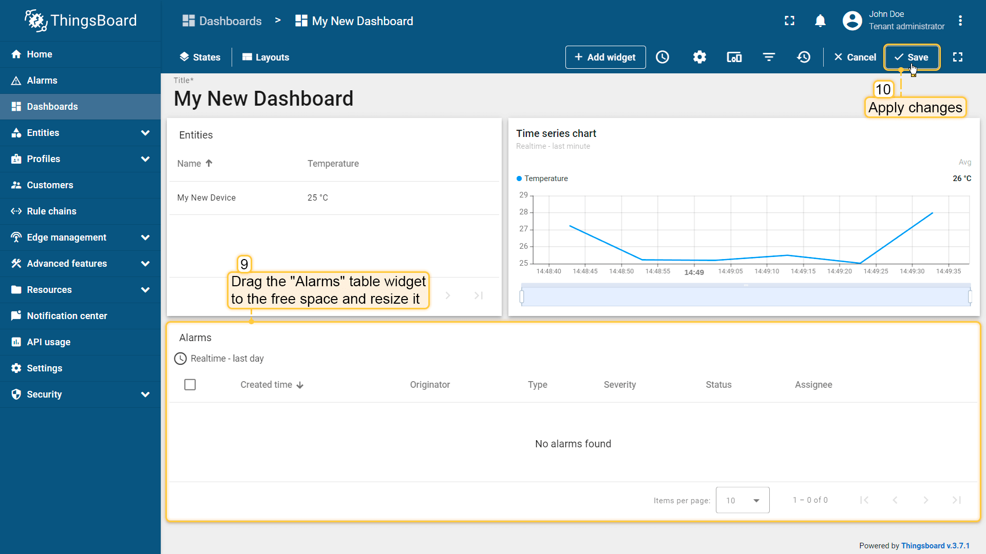 - Congratulations! You have added the alarm widget. By default, new widgets are added one below the other, stacking downwards. Let's organize our widgets a bit to tidy up their arrangement. Drag the "Time series chart" widget to the top right corner of the dashboard to make room for the "Alarms table" widget;