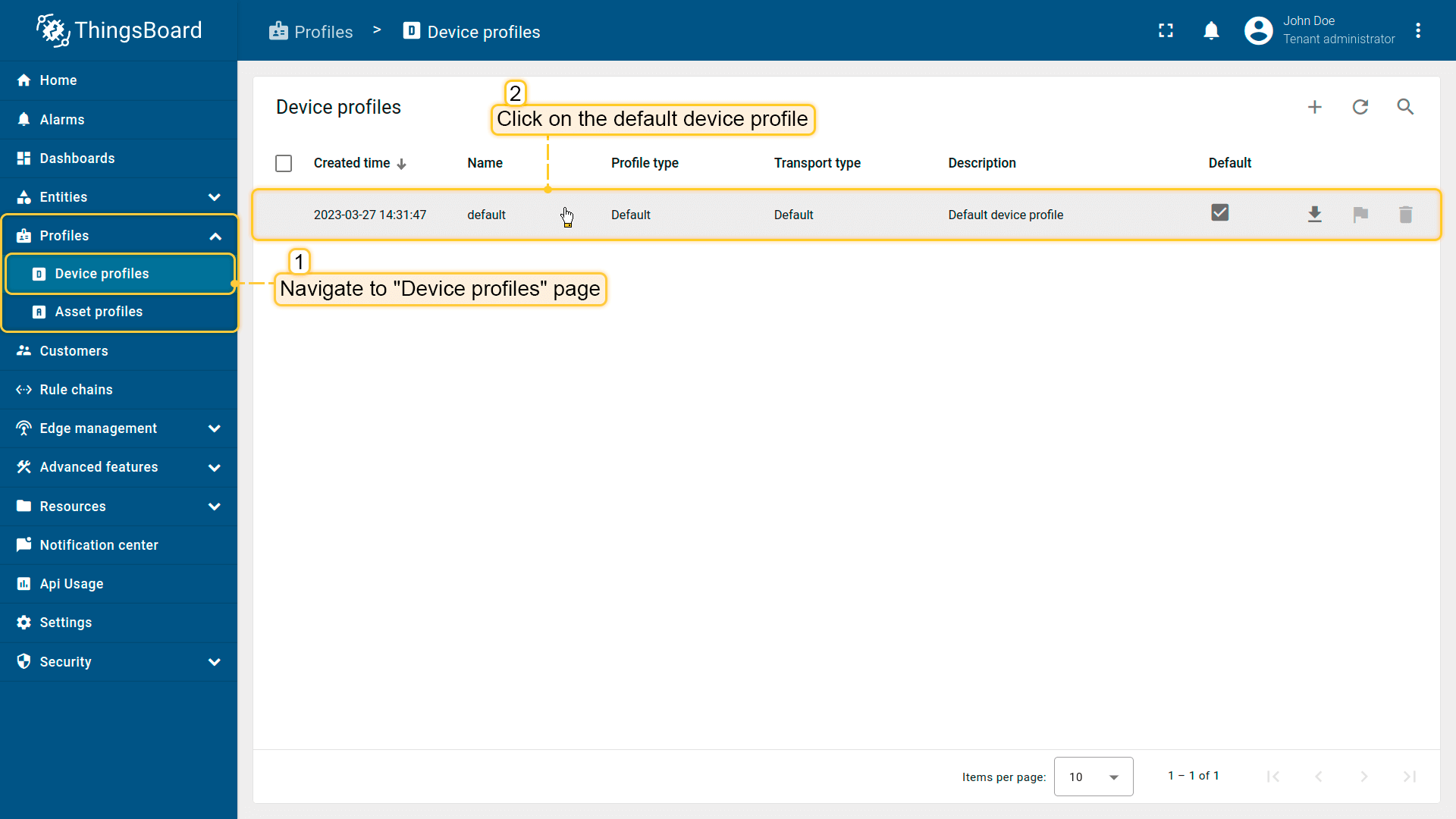 - Go to the "Device profiles" page of the "Profiles" section. Then click on the default device profile row to open its details;