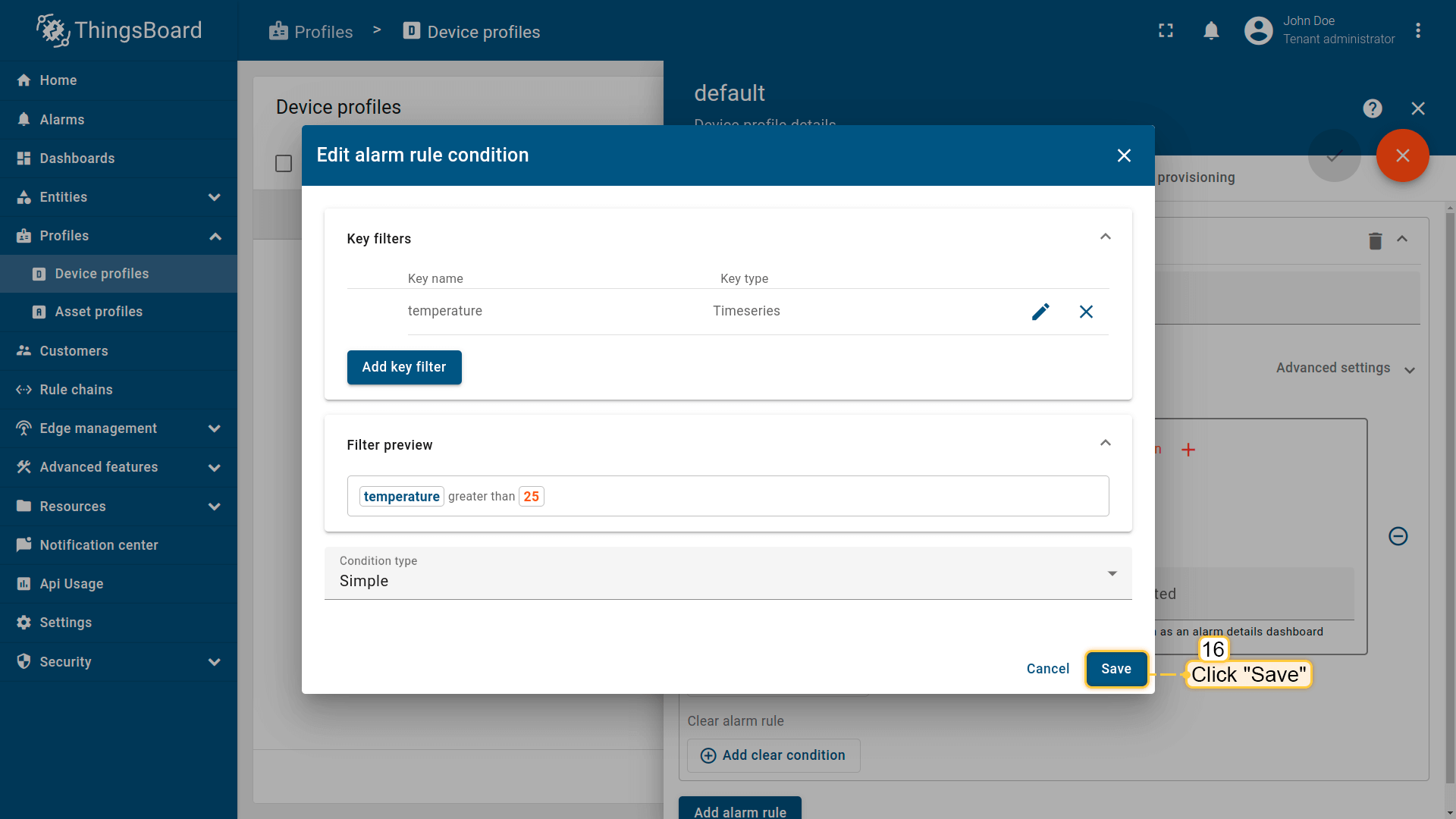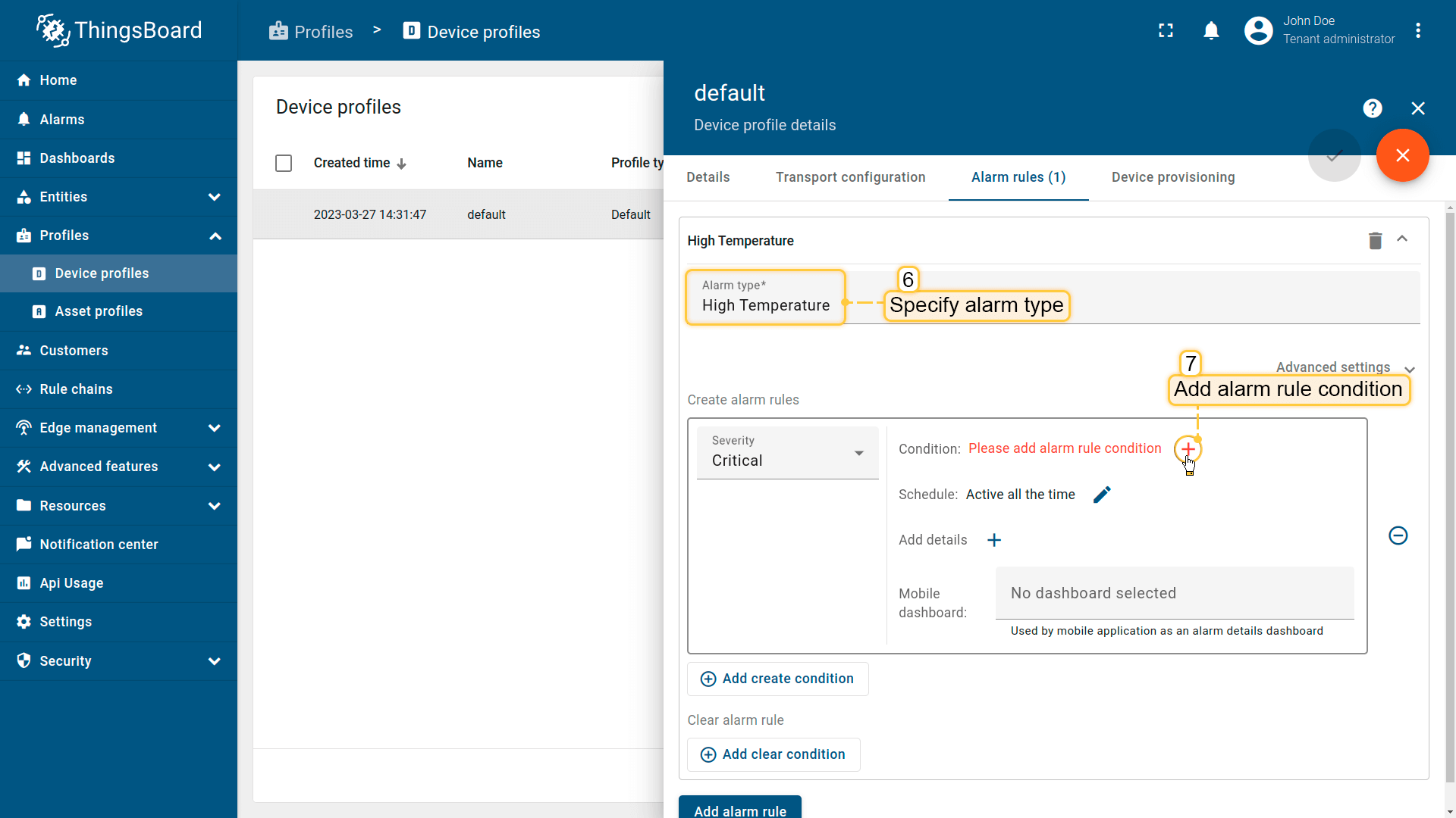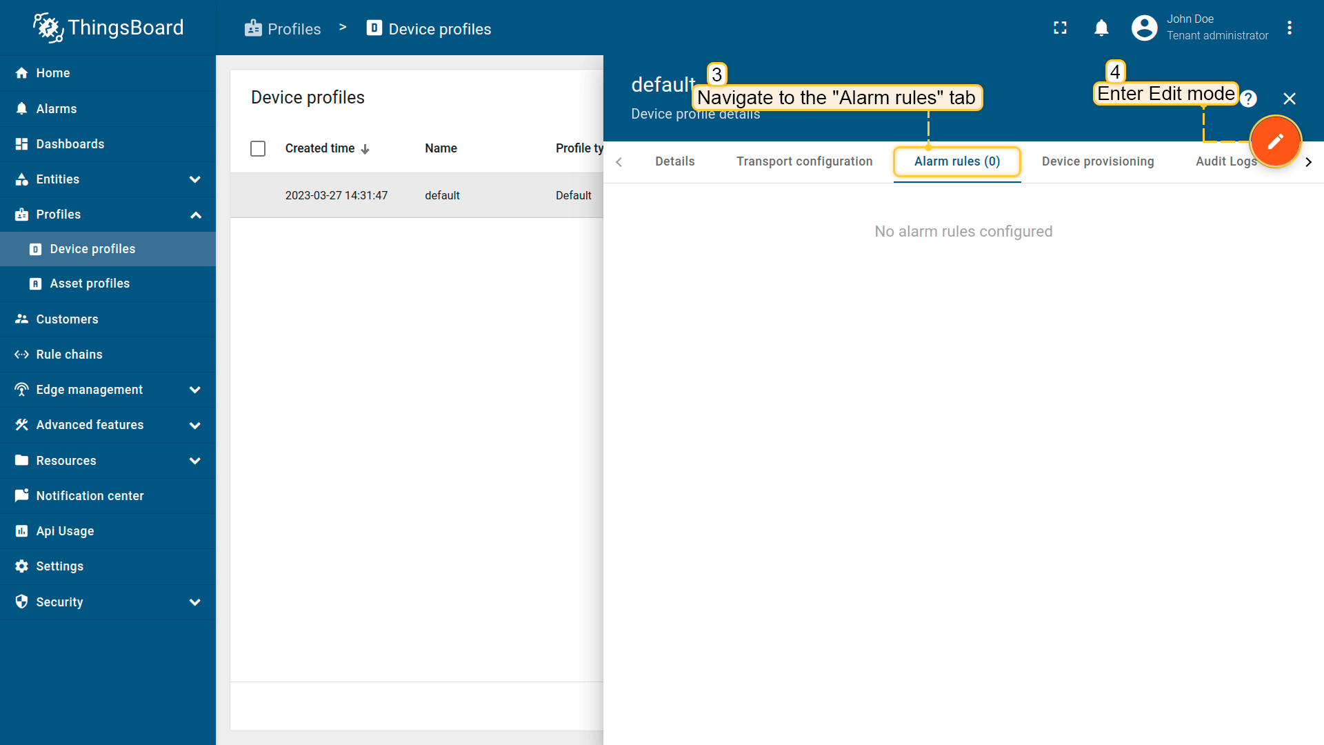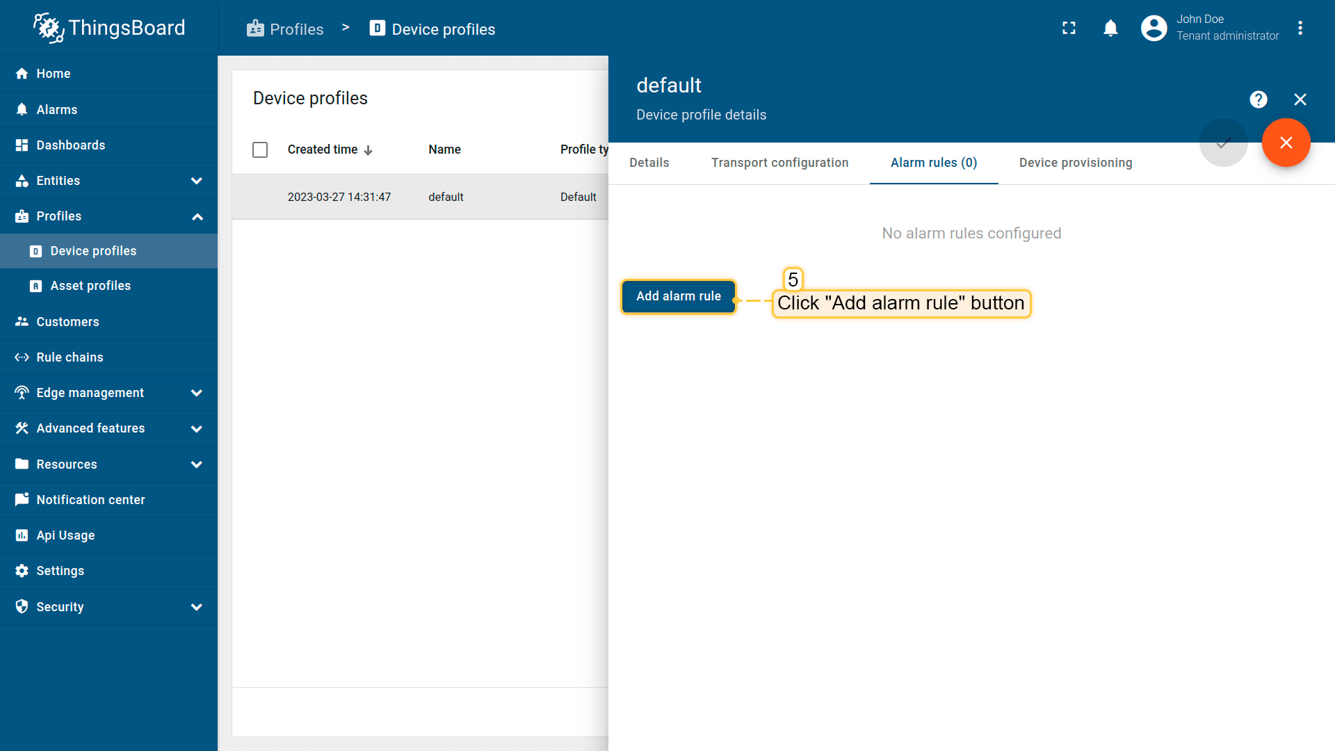 We will use the alarm rules feature to raise the alarm when the temperature reading exceeds 25 degrees. To do this, we should edit the device profile and add a new alarm rule. The “My New Device” is using the “Default” device profile. We recommend creating dedicated device profiles for each corresponding device type, but we'll skip this step here for simplicity.