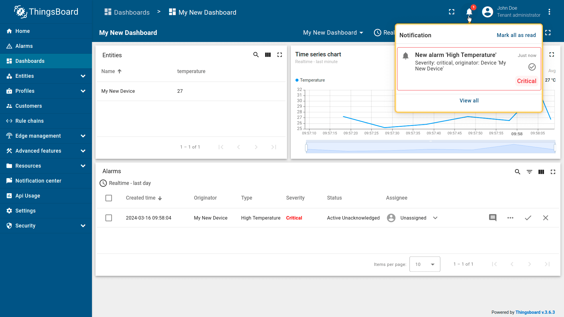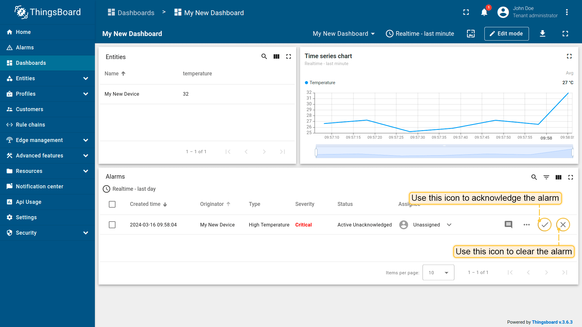 Now, our alarm rule is active (see Step 4), and we should send new telemetry on behalf of the device (see Step 2) to trigger the alarm. Note that the temperature value should be 26 or higher to raise the alarm. Once we send a new temperature reading, we should immediately see a new alarm on our dashboard.
