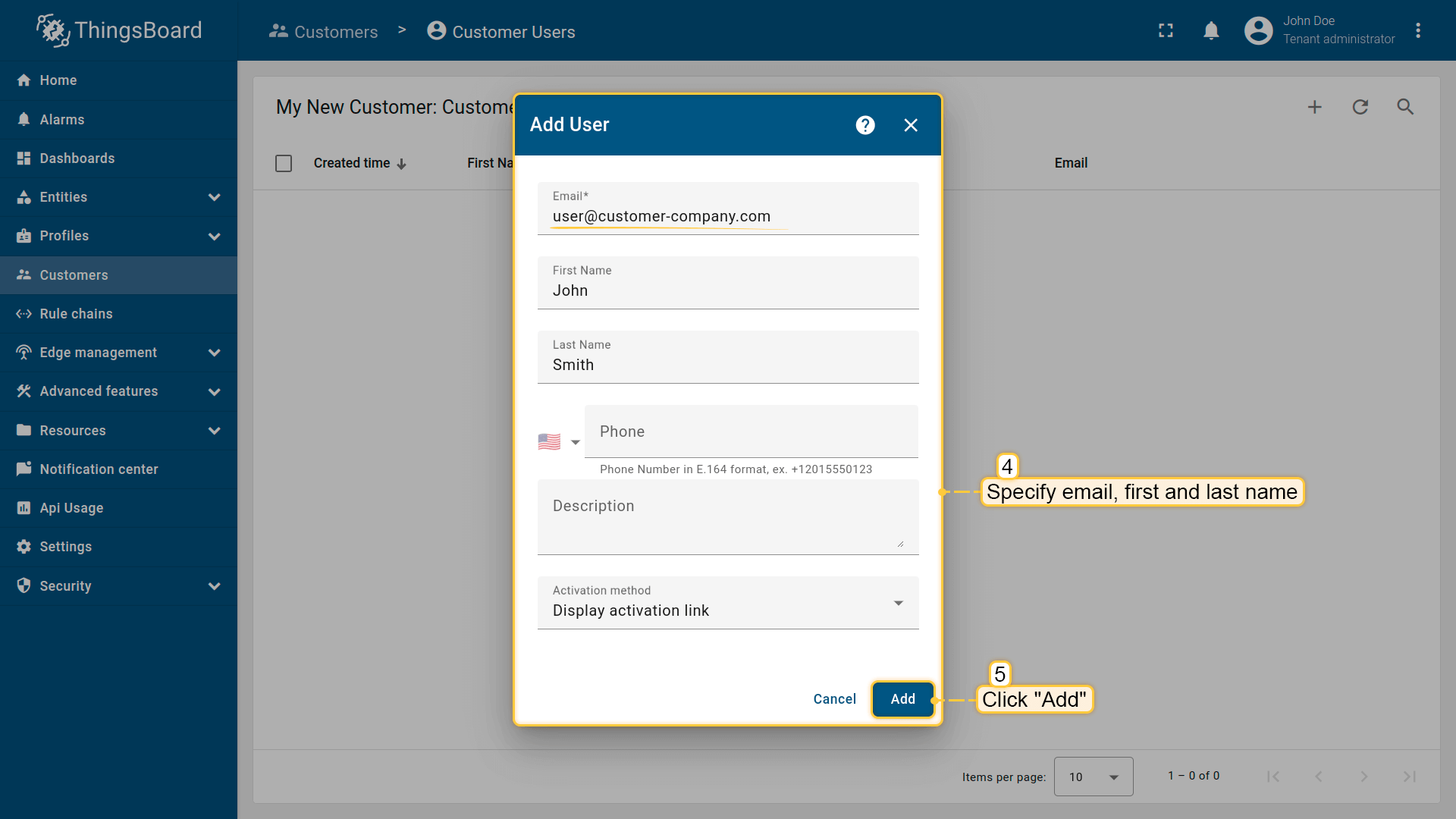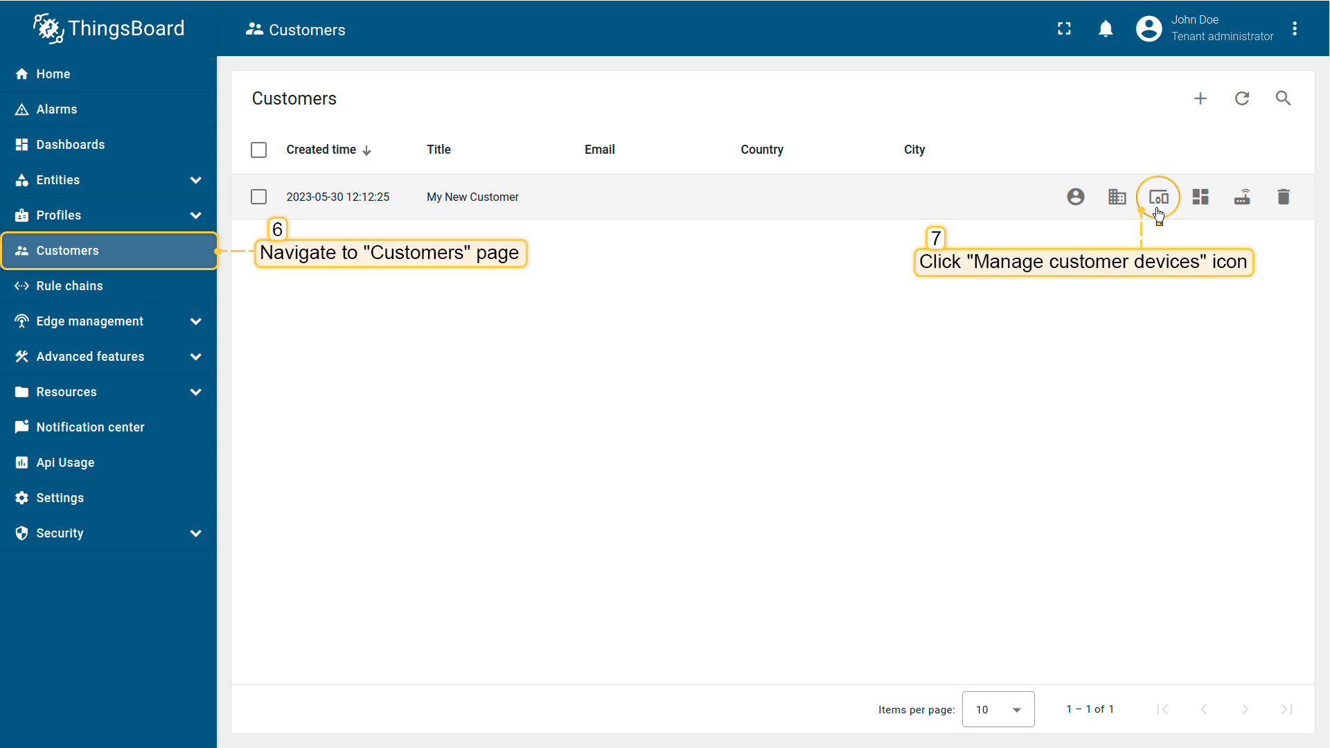 We have already created a Device (see Step 1), and a Dashboard (see Step 3). Now it's time to create a Customer and a Customer User and make sure they will have access to the device’s data and the dashboard.