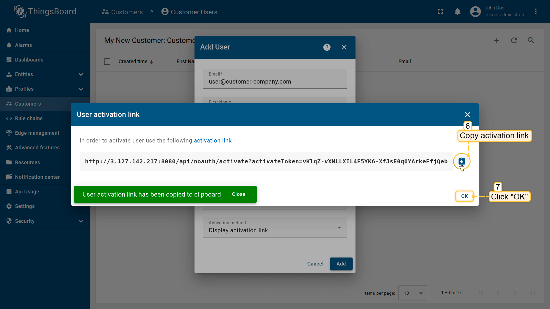 - Copy the activation link and save it to a safe place. You will use it later to set the password. Click "OK";