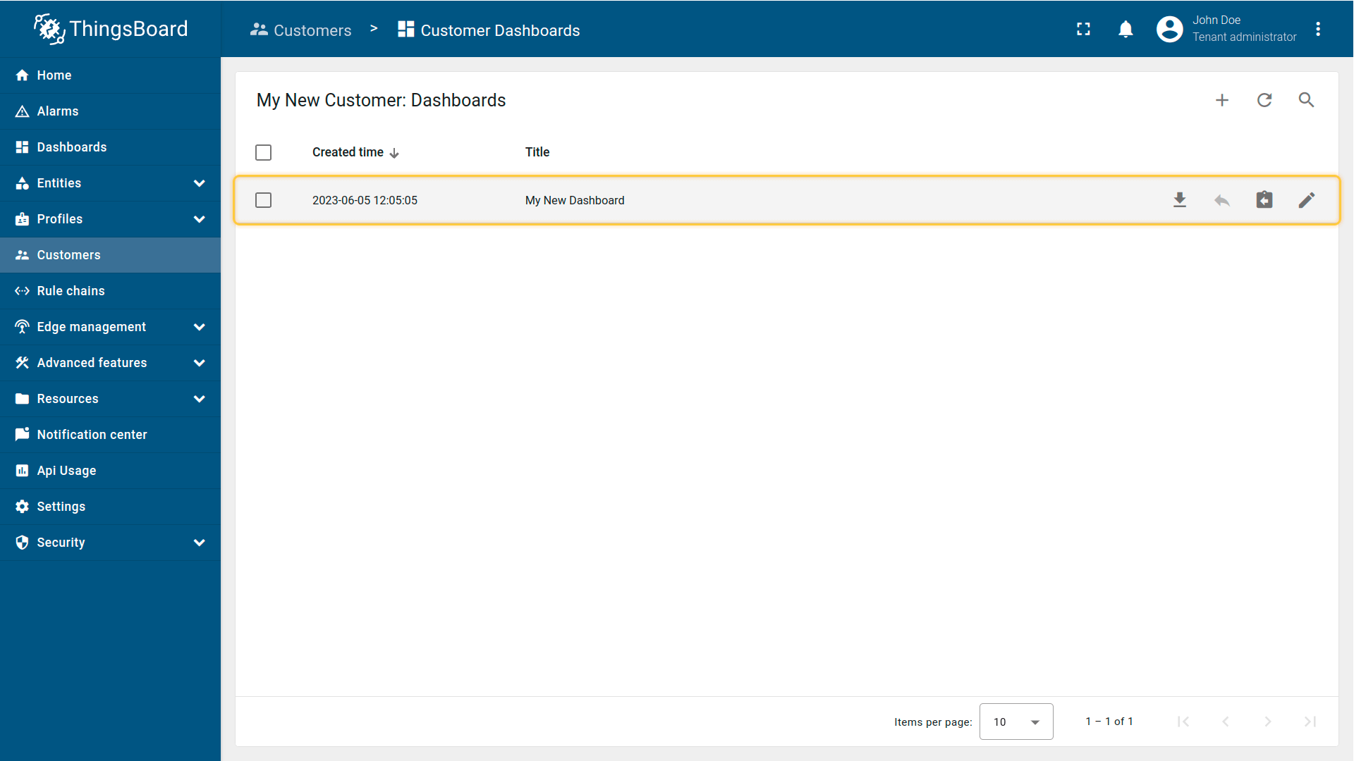 - Navigate to the "Customers" page. Click "Manage customer dashboards" icon for "My New Customer";