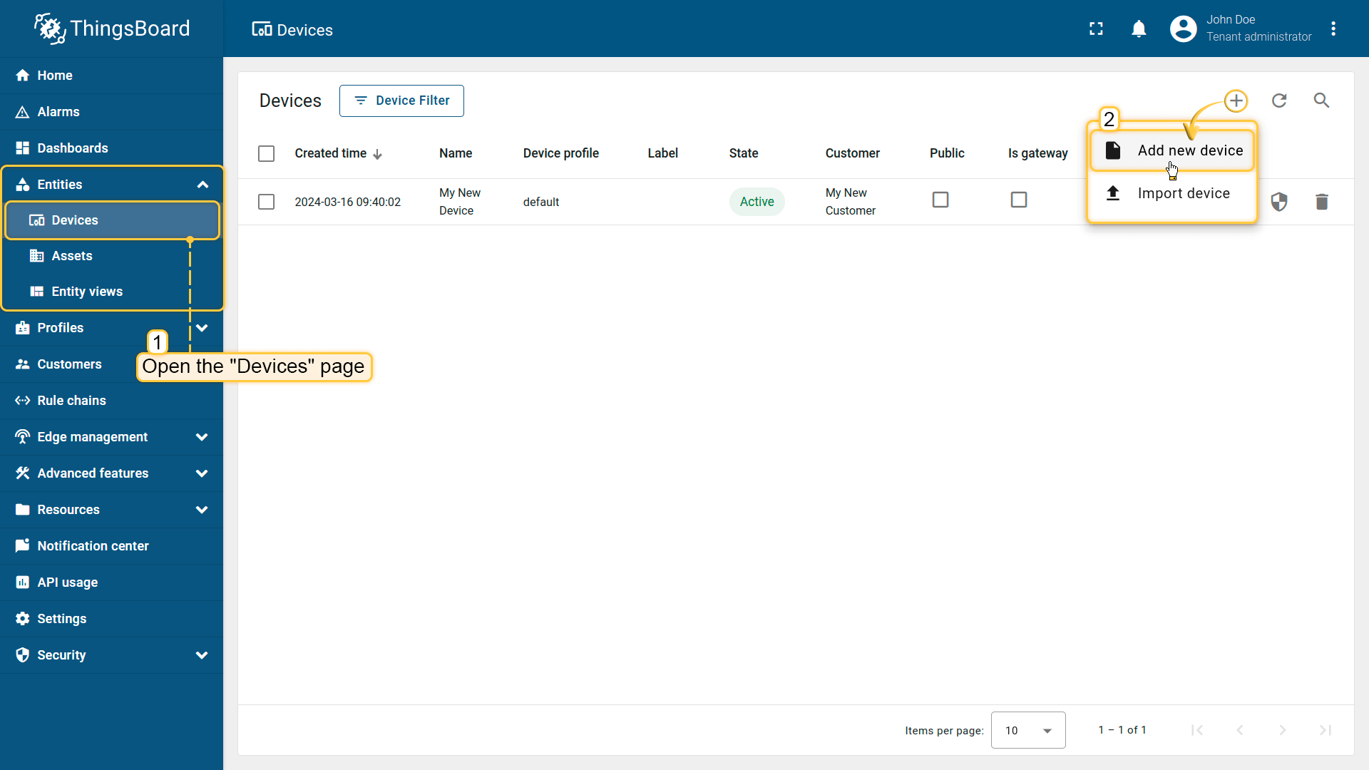 - Log in to IoT Hub and navigate to the "Devices" page of the "Entities" section.